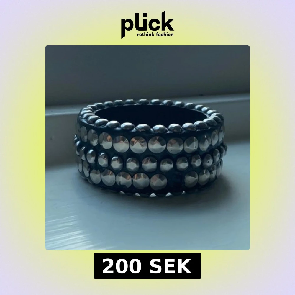 Coolt brett armband i svart med silvriga nitar/stenar runt hela. Skit coolt armband som verkligen kan göra en outfit. En av de silvriga nitarna/stenarna har ramlat av men annars är de i toppskick! Köpt från Sellpy men aldrig använt själv då de inte passade. Diamater i cm = 7. Hör av dig om du har några frågor!💞💞