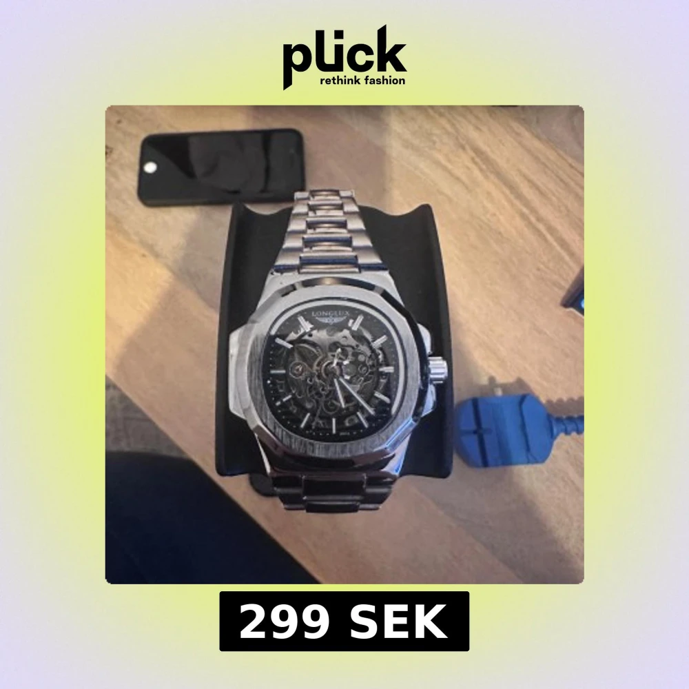 Snygg silverfärgad klocka från Longex med ett detaljerat urverk som syns genom urtavlan. Klockan har en robust metallarmband och en klassisk rund boett. Perfekt för den som gillar en stilren och elegant look.