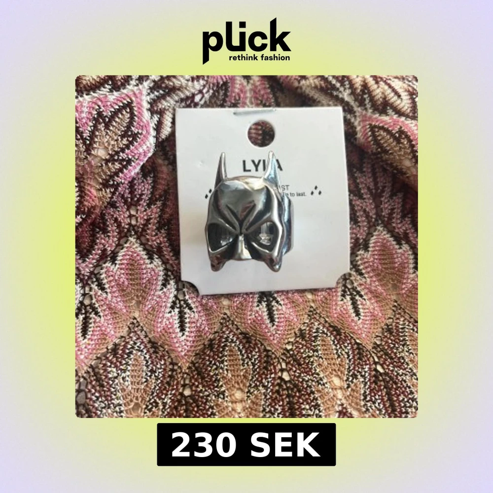 Cool statementring i form av en Batman-mask från Lyla. Ringen är i blank silverfärg och har tydliga detaljer med spetsiga öron och markerade ögonhål. Perfekt accessoar för dig som gillar superhjältar och vill sticka ut. Ringen är ALDRIG använd och helt ny.