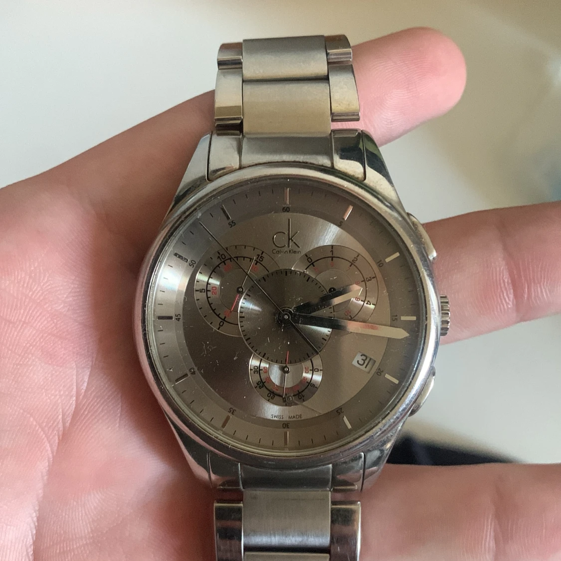 Stilren herrklocka från Calvin Klein i silverfärgat rostfritt stål. Klockan har rund urtavla med flera små visare, datumfunktion och länkarmband. CK-logga på både urtavla och baksida. Perfekt accessoar för dig som gillar minimalistisk design och metalliska detaljer. Kan gå ner i pris vid snabb äffer.