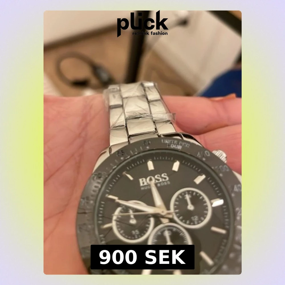 Stilren klocka från Hugo Boss med svart urtavla och silverfärgat armband i rostfritt stål. Klockan har tre mindre urtavlor, tydliga indexmarkeringar och en sportig bezel med siffror. Länken är robust och har Boss-loggan på spännet.