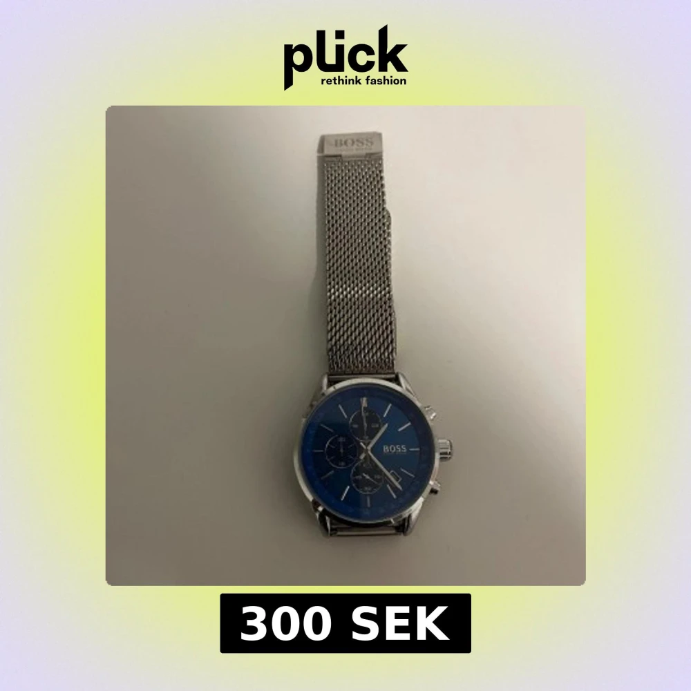 Stilren klocka från BOSS med blå urtavla och tre mindre sub-dials. Armbandet är i silverfärgat mesh-stål och har en klassisk spänne. Perfekt för den som gillar en elegant och modern look. Oanvänd så 10/10 skick.