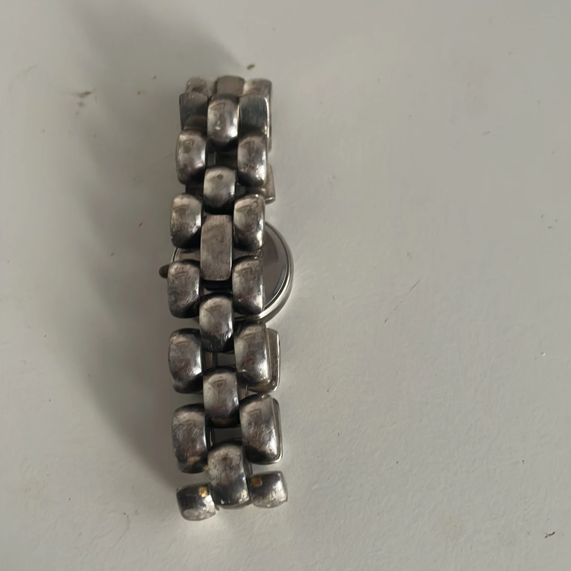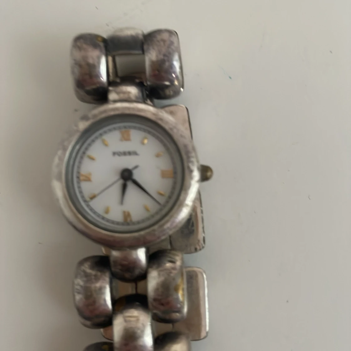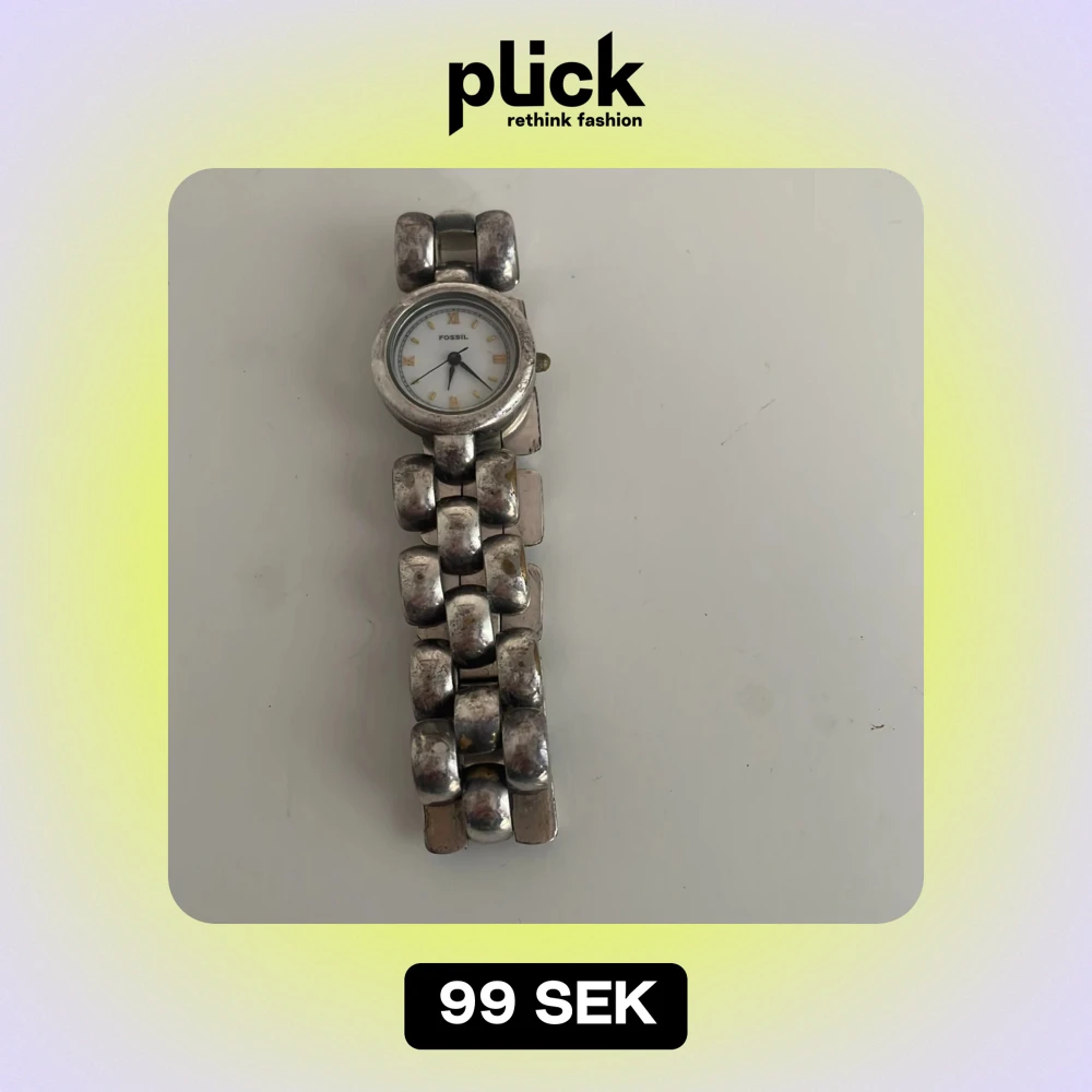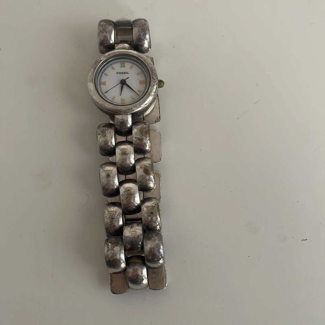 Säljer en stilren klocka från Fossil i silverfärg. Den har en unik länkdesign och en vit urtavla med guldiga detaljer. Perfekt för både vardag och fest. Klockan är i acceptabelt skick med lite slitage på länken. Passa på att köpa denna tidlösa accessoar!