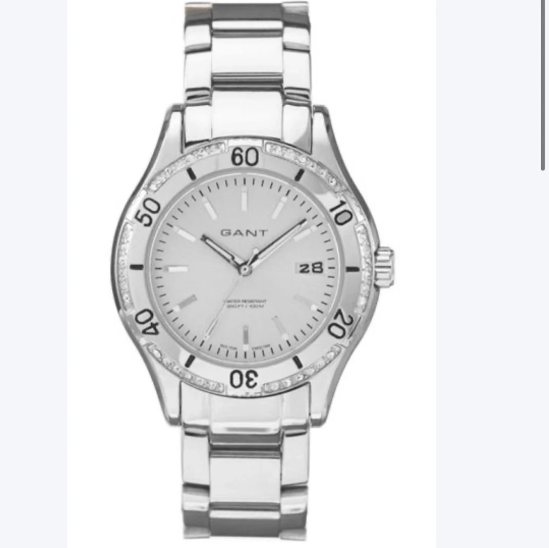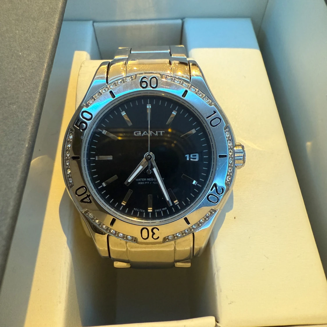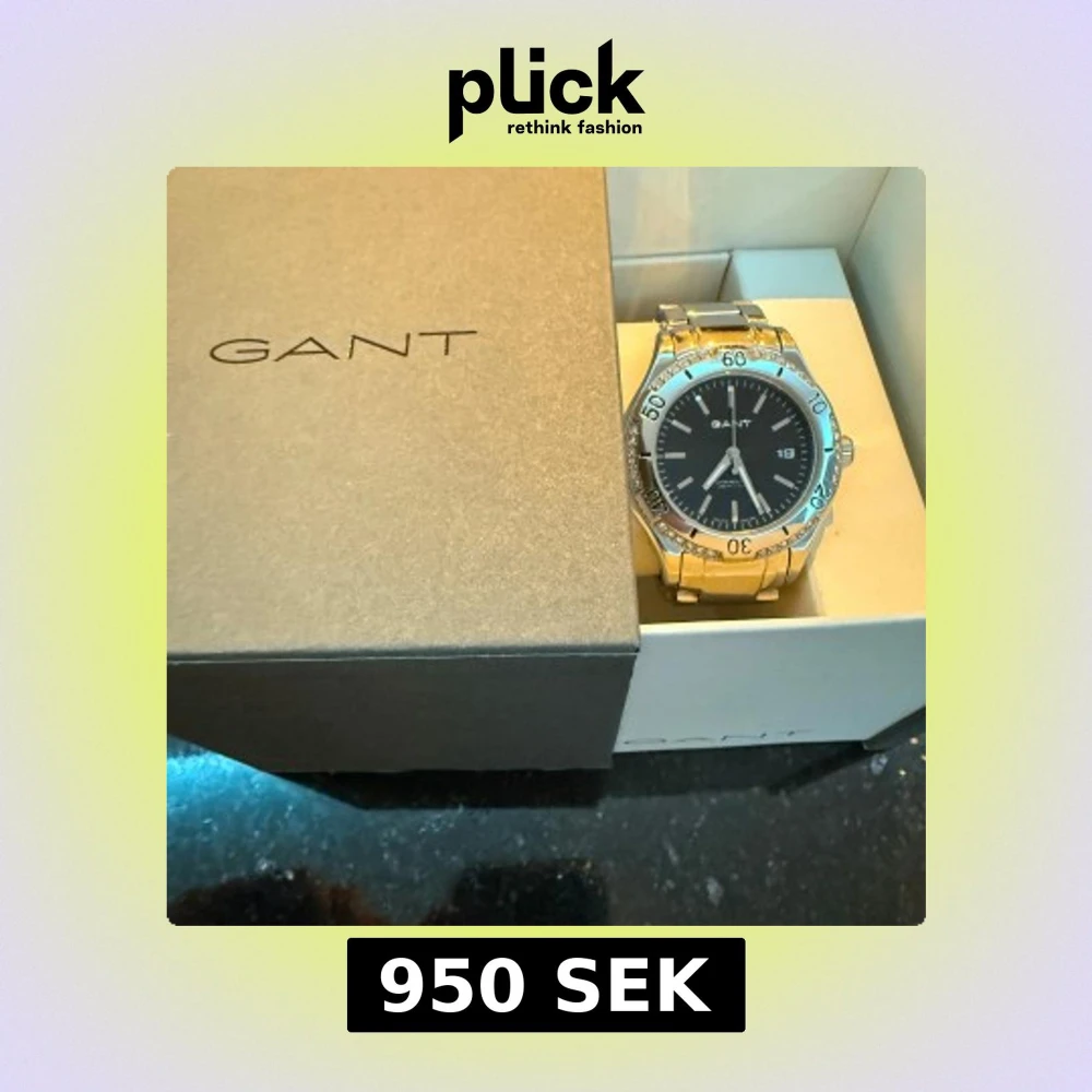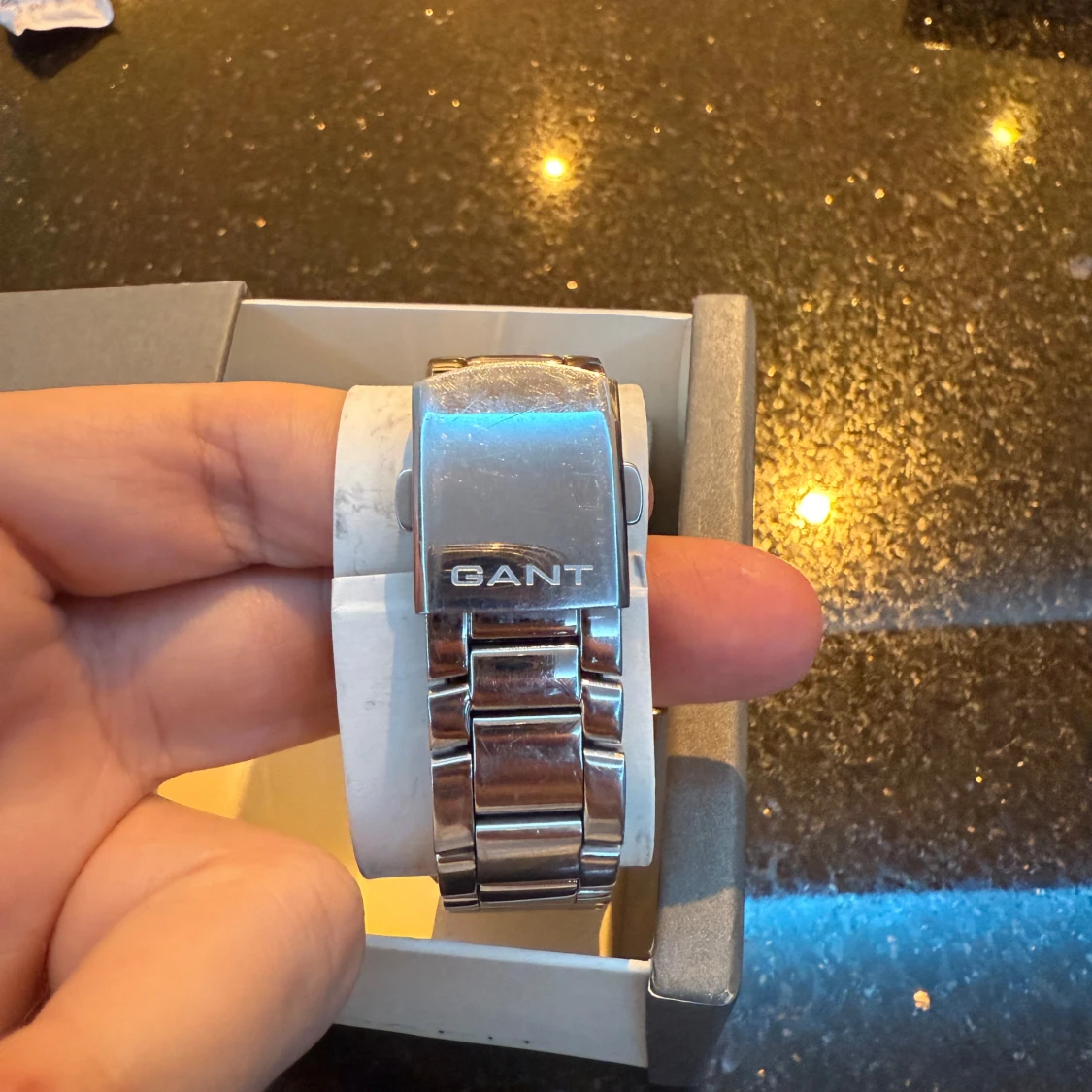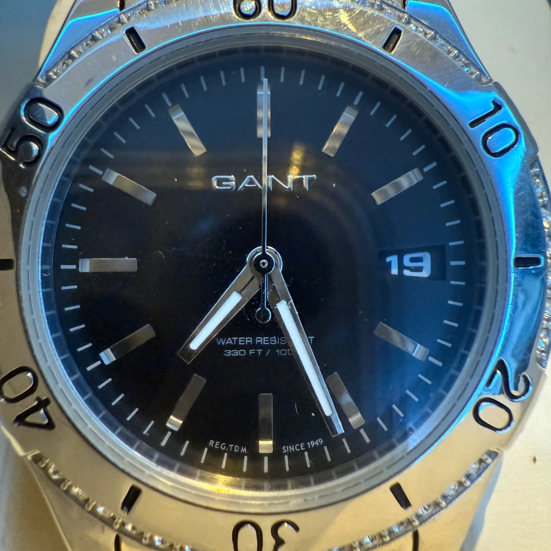 OBS: BATTERIET MÅSTE BYTAS. Snygg silverfärgad klocka från GANT med svart urtavla och datumvisning. Klockan har en glittrig bezel och tydliga markeringar. Armbandet är i metall och har en säkerhetslåsning med GANT-logga. Perfekt för den som vill ha en stilren och elegant accessoar. Sista bilden visar vad den har kostat, knappt använd, kan självklart gå ner i pris vid snabb affär, postar inom 1 dag