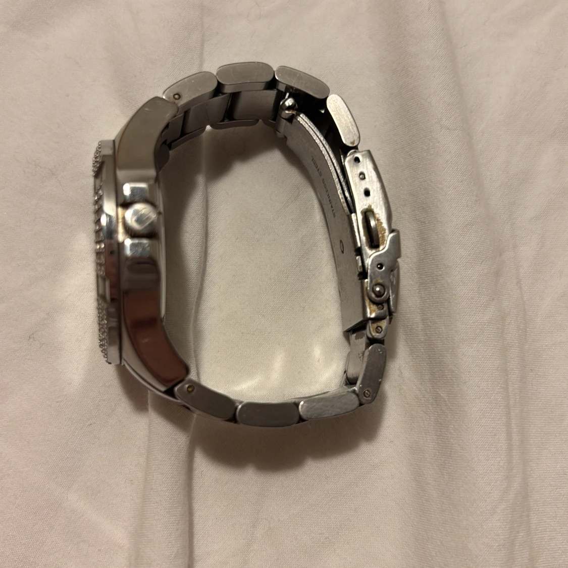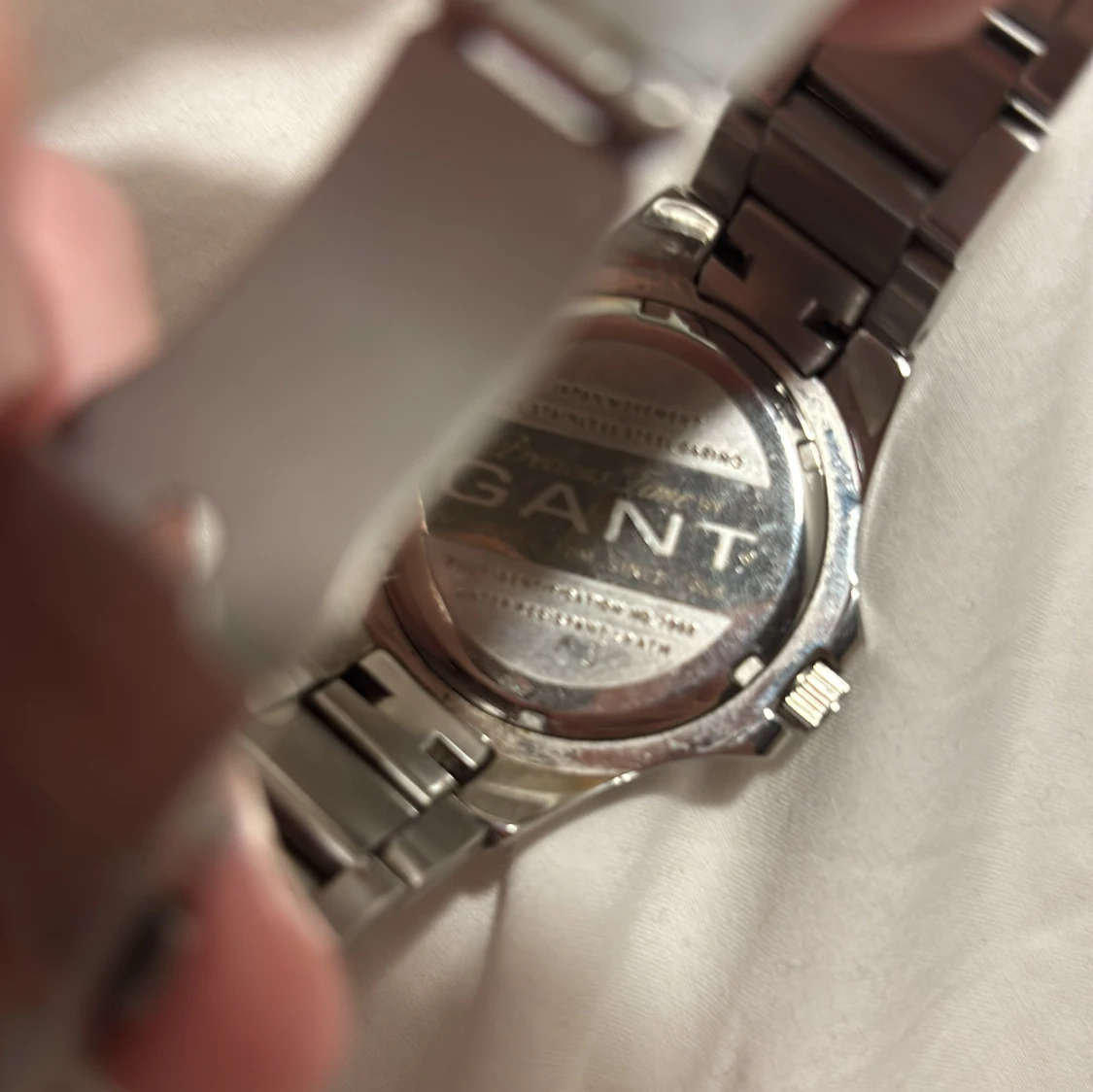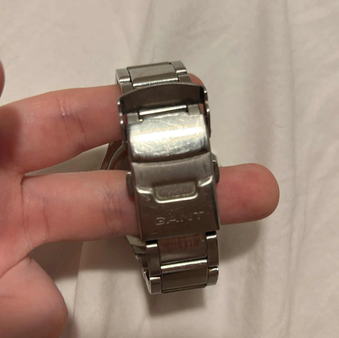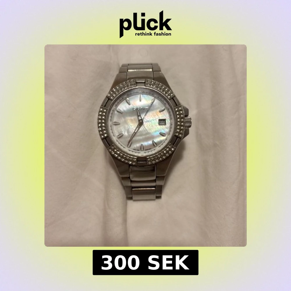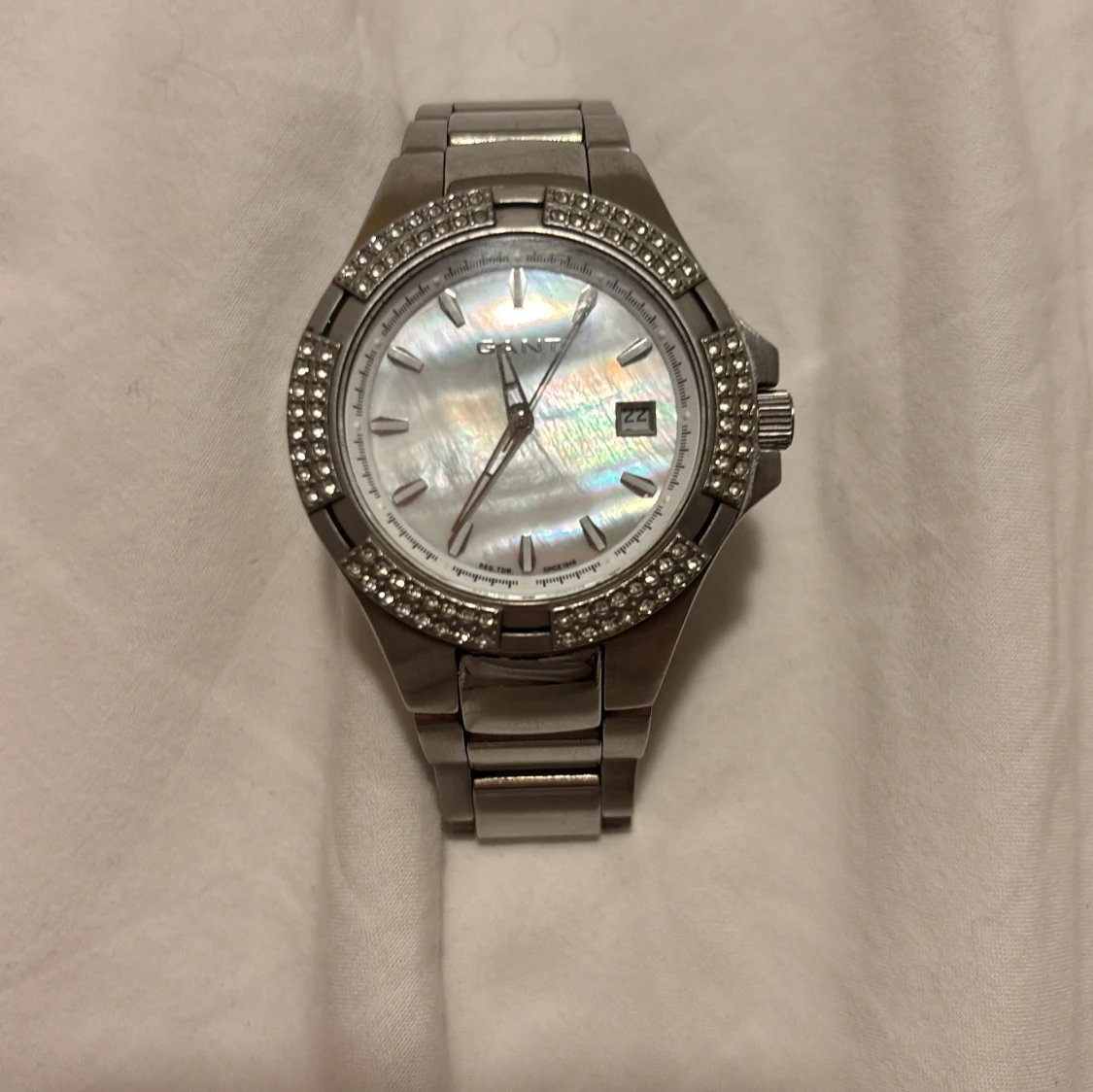 Stilren klocka från GANT i silverfärgat metallarmband. Urtavlan har pärlemorskimrande yta och är omgiven av två rader glittrande stenar. Klockan har datumvisning och robust länkarmband med spänne där GANT-loggan är ingraverad. Den är tydligt använd, se exempel på en bild, men fortfarande väldigt fin överlag! Den tickar som den ska men datumet på klockan är fel ser jag, men det går att ändra. Storleken är ganska liten då jag har en ganska smal handled. Skriv privat för fler bilder osv!