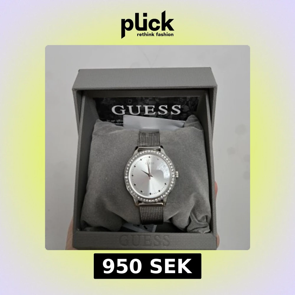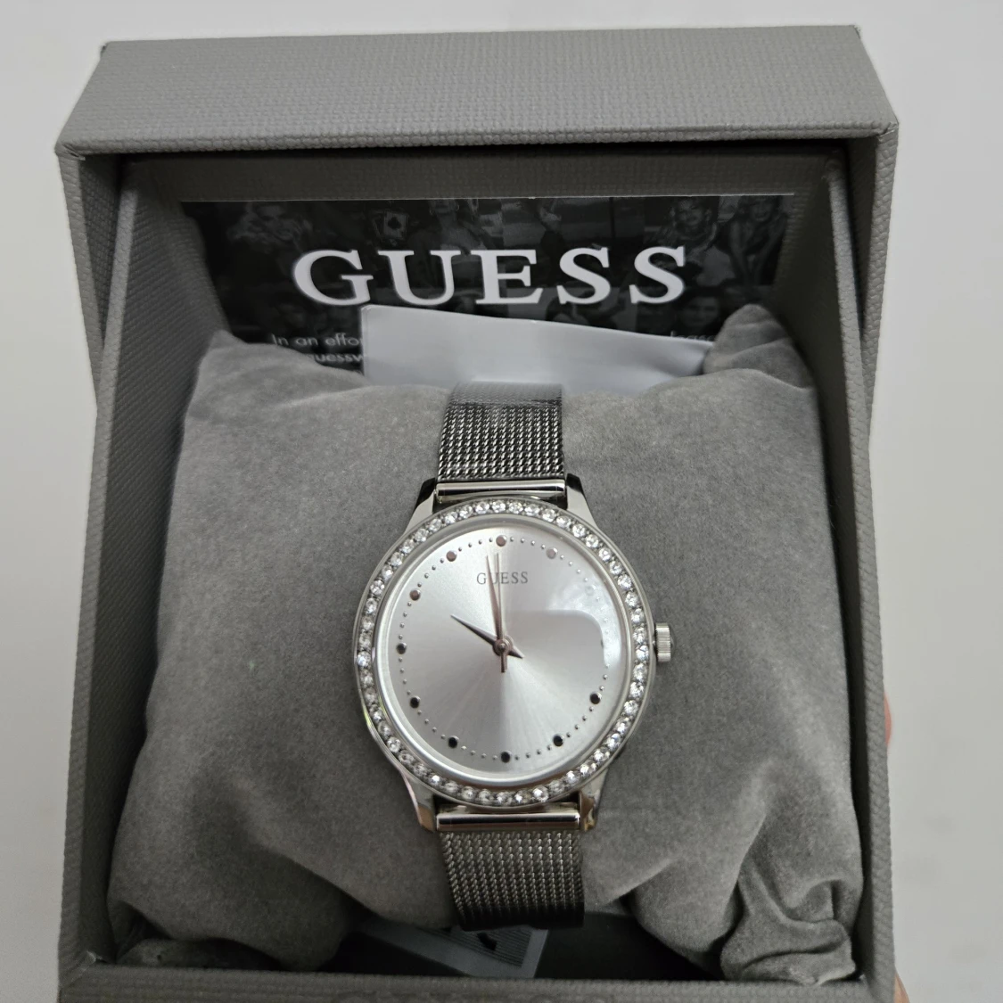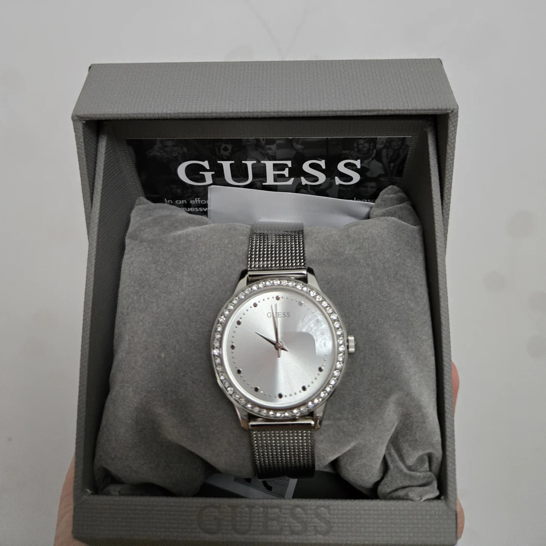 Stilren klocka från Guess med silverfärgat mesharmband och rund urtavla. Urtavlan är dekorerad med glittrande stenar runt kanten och har minimalistiska markeringar. Klockan levereras i originalask och har en elegant, modern look.
