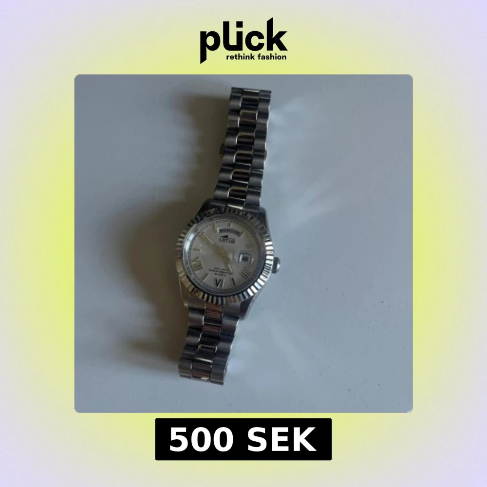 Stilren klocka från Lotus med silverfärgat armband i metall och klassisk rund urtavla. Urtavlan har dag- och datumvisning samt romerska siffror och gulddetaljer. Länken är robust och har en snygg spänne med Lotus-logga. Perfekt accessoar för dig som gillar tidlös design.