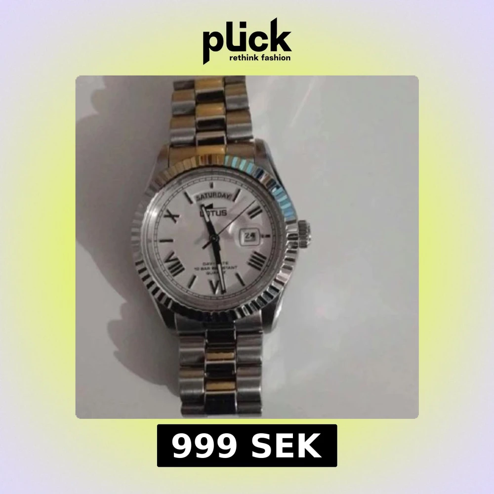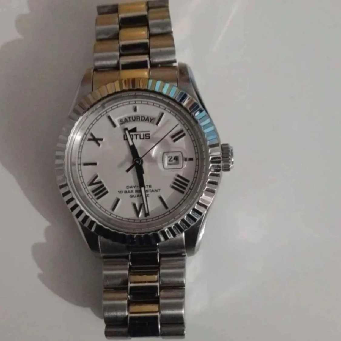 Ny pris 1600kr. Stilren silverfärgad klocka från Lotus med dag- och datumvisning. Den har en klassisk länkarmband och romerska siffror på urtavlan. Perfekt för en elegant look.
