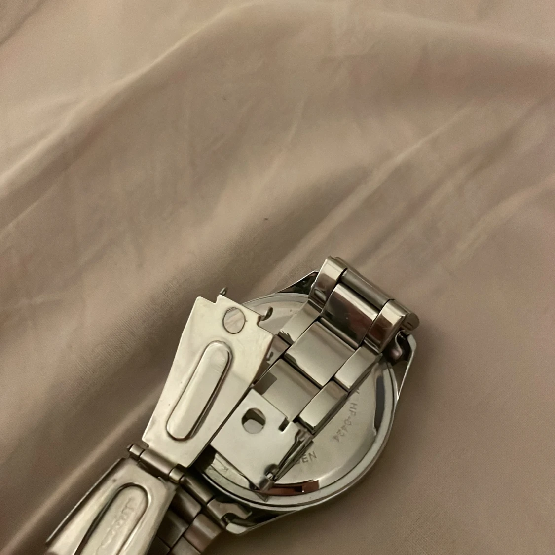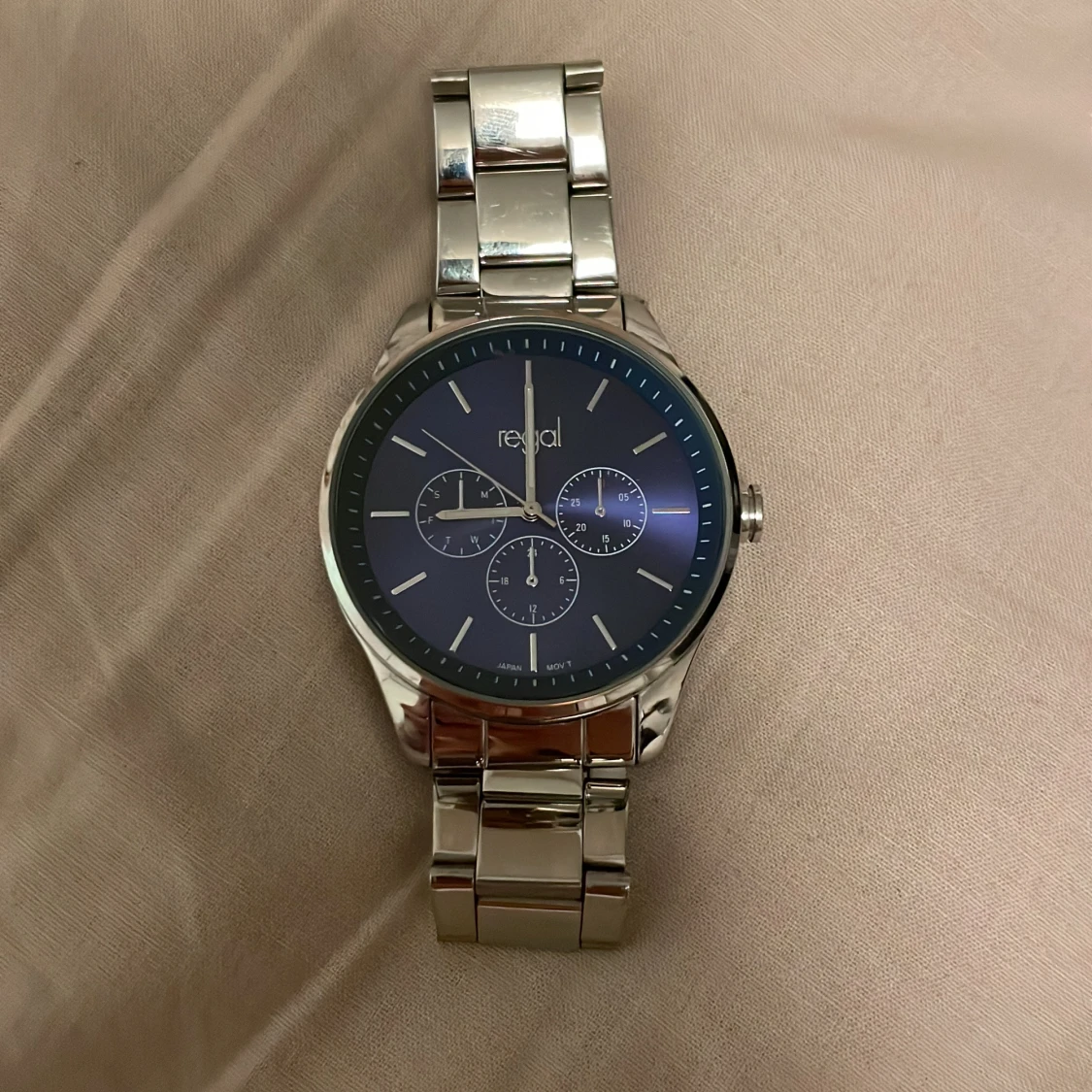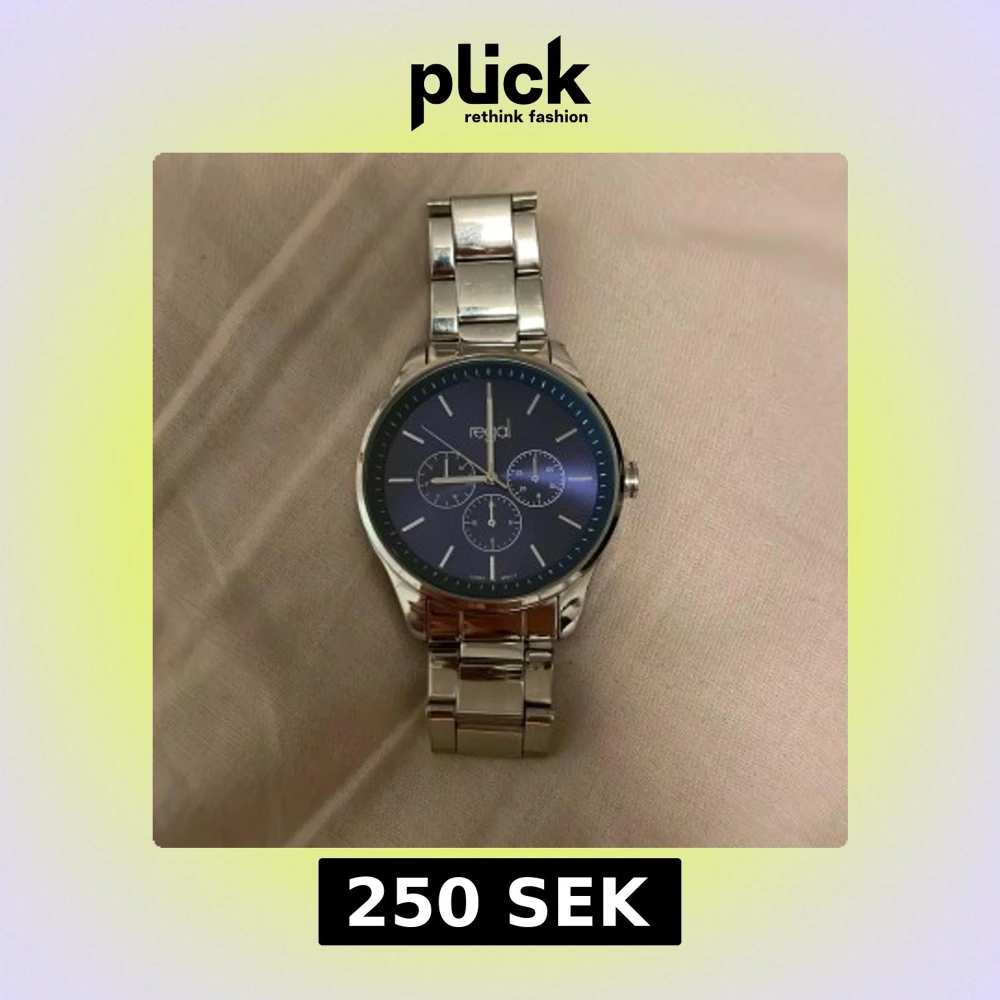 Stilren klocka från Regal med blå urtavla och silverfärgat armband i metall. Länken är robust och har ett klassiskt spänne. Spännet har gått av men går att fixa på nån smyckes affär, och tror inte det kostar så mycket men där av priset. Skick 9/10 Inga repor eller liknande på glaset. Hör av dig vid minsta fundering och pris kan diskuteras vid snabb affär!
