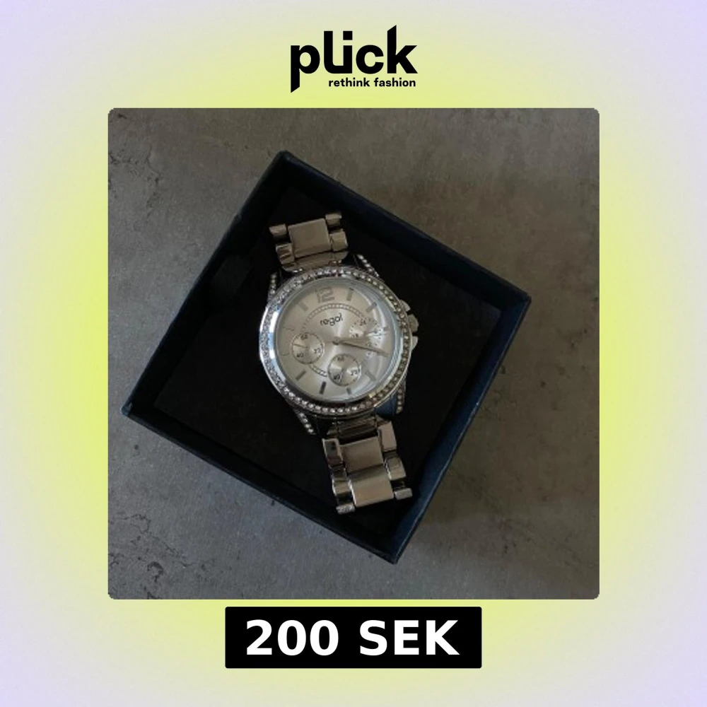 Elegant silverfärgad klocka från Regal med glittriga detaljer runt urtavlan. Klockan har en metallarmband och tre små urtavlor inuti den större urtavlan. Oanvänd & mycket bra skick.