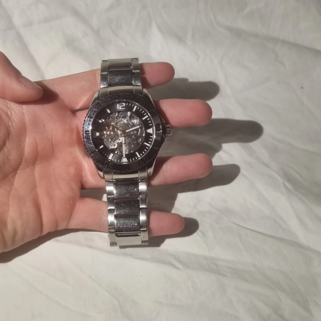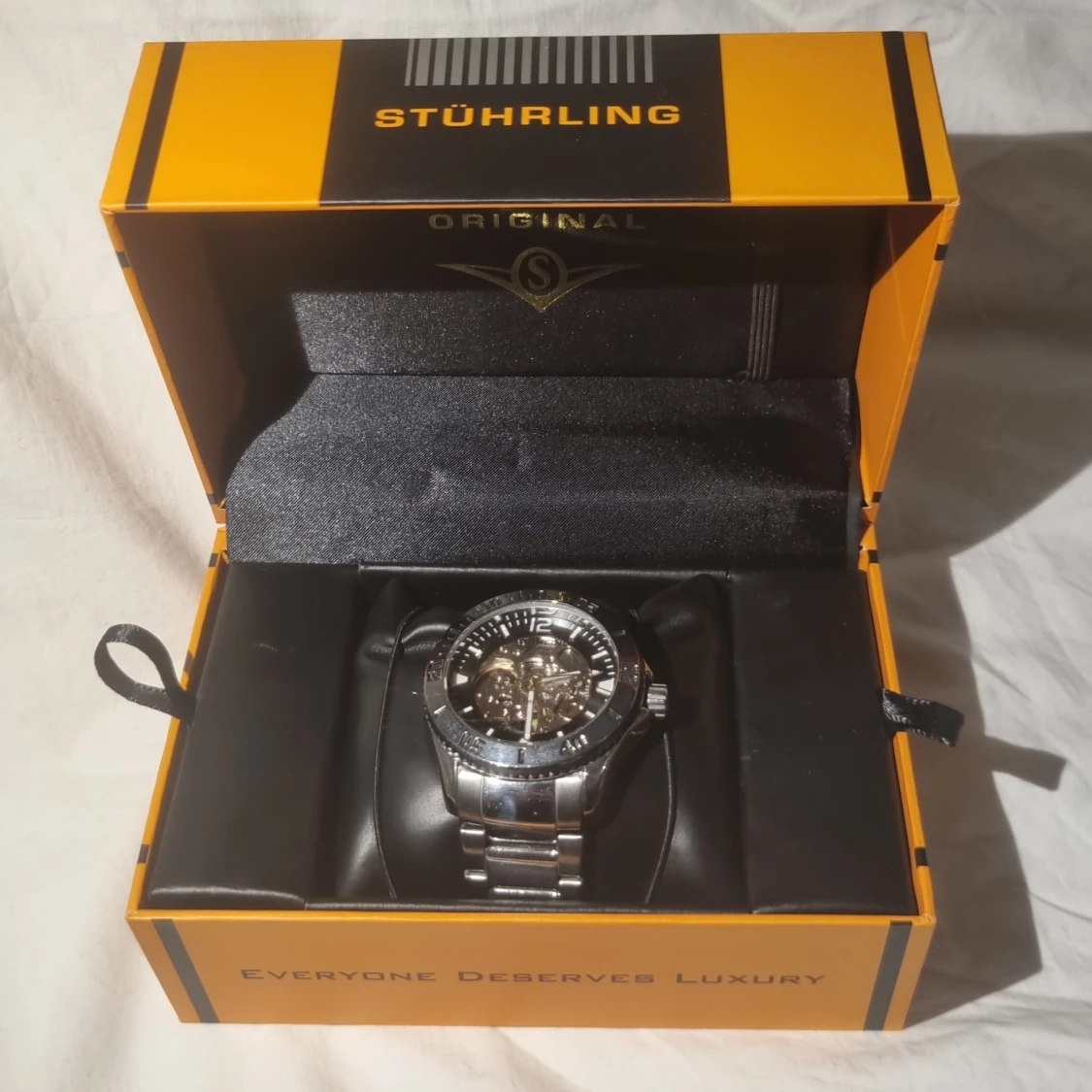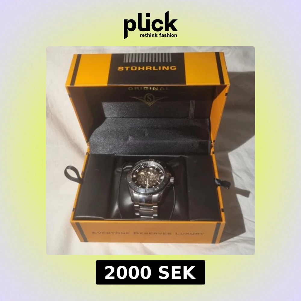 Snygg silverfärgad klocka från Stührling med synlig urtavla och robust metallarmband. Klockan kommer i en elegant orange och svart förpackning. Perfekt för den som vill ha en stilren och lyxig accessoar. Originelt köpt för 2700 men säljs för 2000. Finns ett litet fel på ringen runt glaset då den sitter lite löst. Sparsamt använd och i mycket bra skick. Cirka 5 Linus är antagna och de linksen följer med.