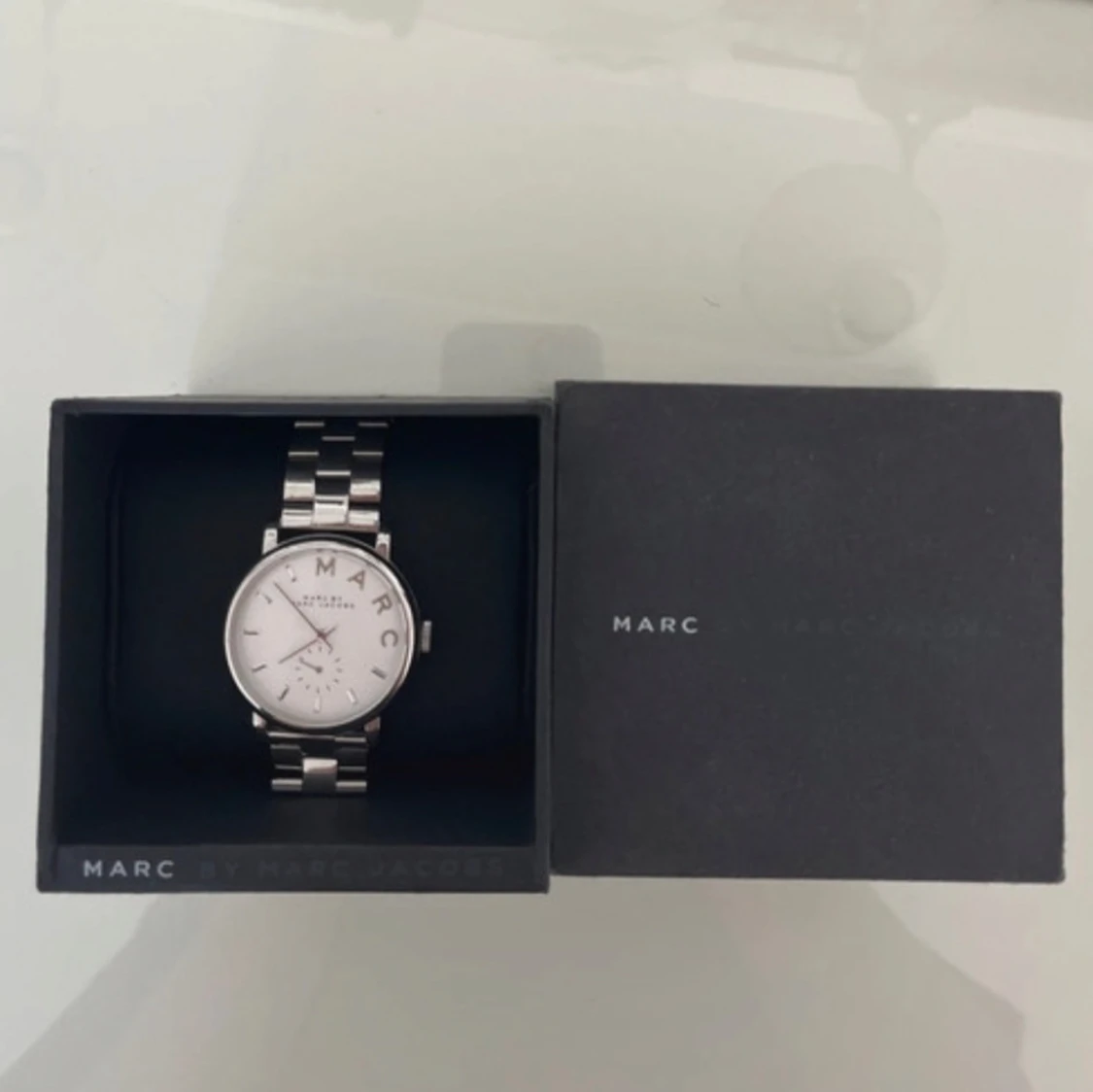 Snygg och stilren klocka från Marc Jacobs i silverfärg med rund urtavla och metallarmband. Urtavlan har tydliga bokstäver och en liten sekundvisare. Kommer i originalask och extra länkar medföljer. Perfekt accessoar för dig som gillar minimalistisk design.