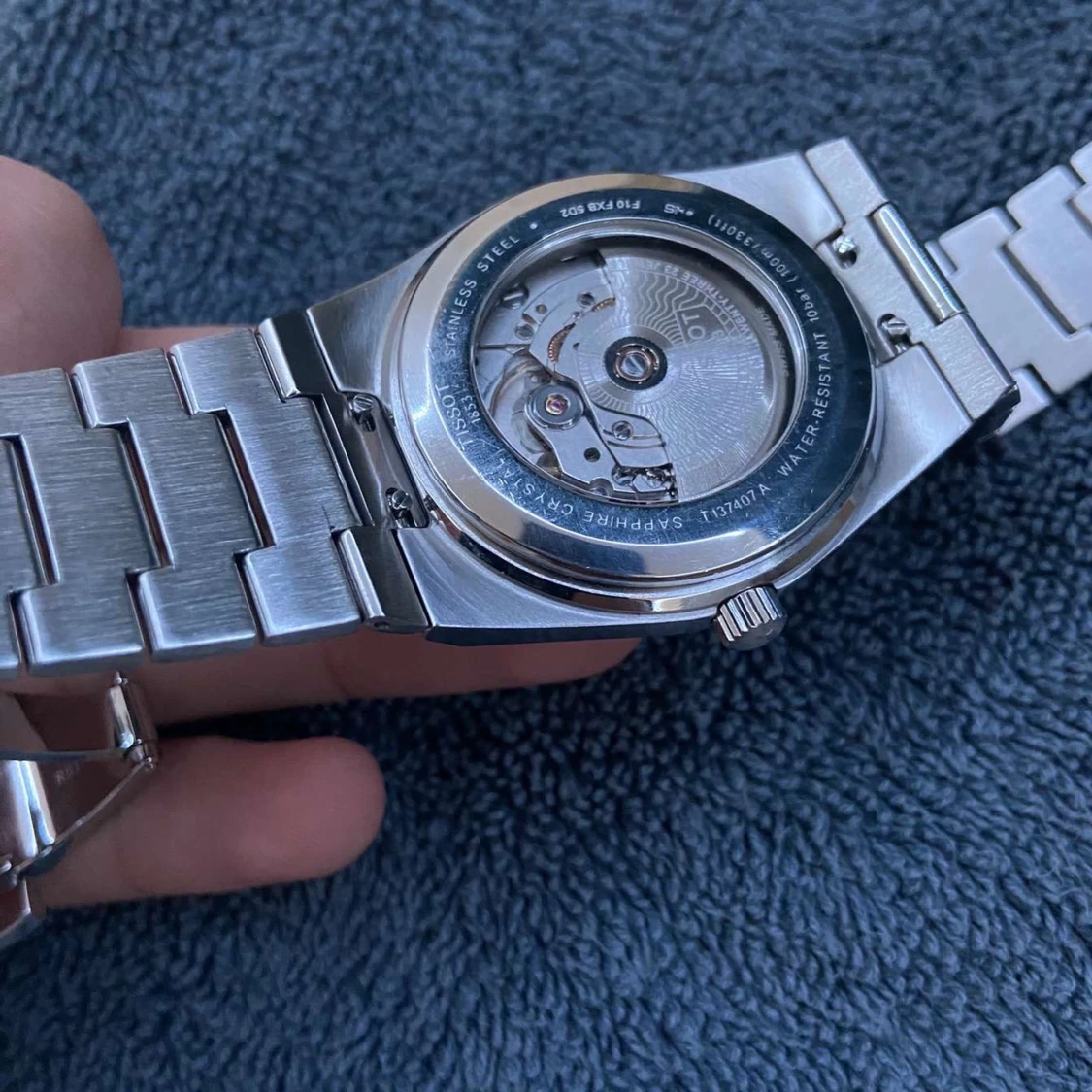 Säljer en stilren klocka från Tissot med en blå urtavla och datumvisning. Klockan har ett silverfärgat armband i metall och en transparent baksida som visar urverket. Perfekt för den som gillar en klassisk och elegant stil.