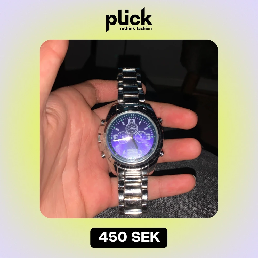 Säljer en snygg klocka i silver med en cool blå urtavla. Den har en robust metallarmband och flera små urtavlor för extra funktioner. Perfekt för både vardag och fest! 🕒✨