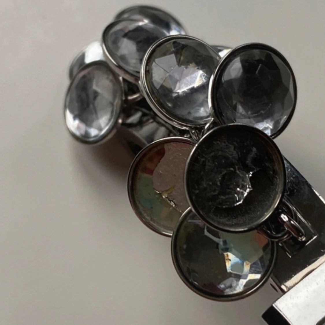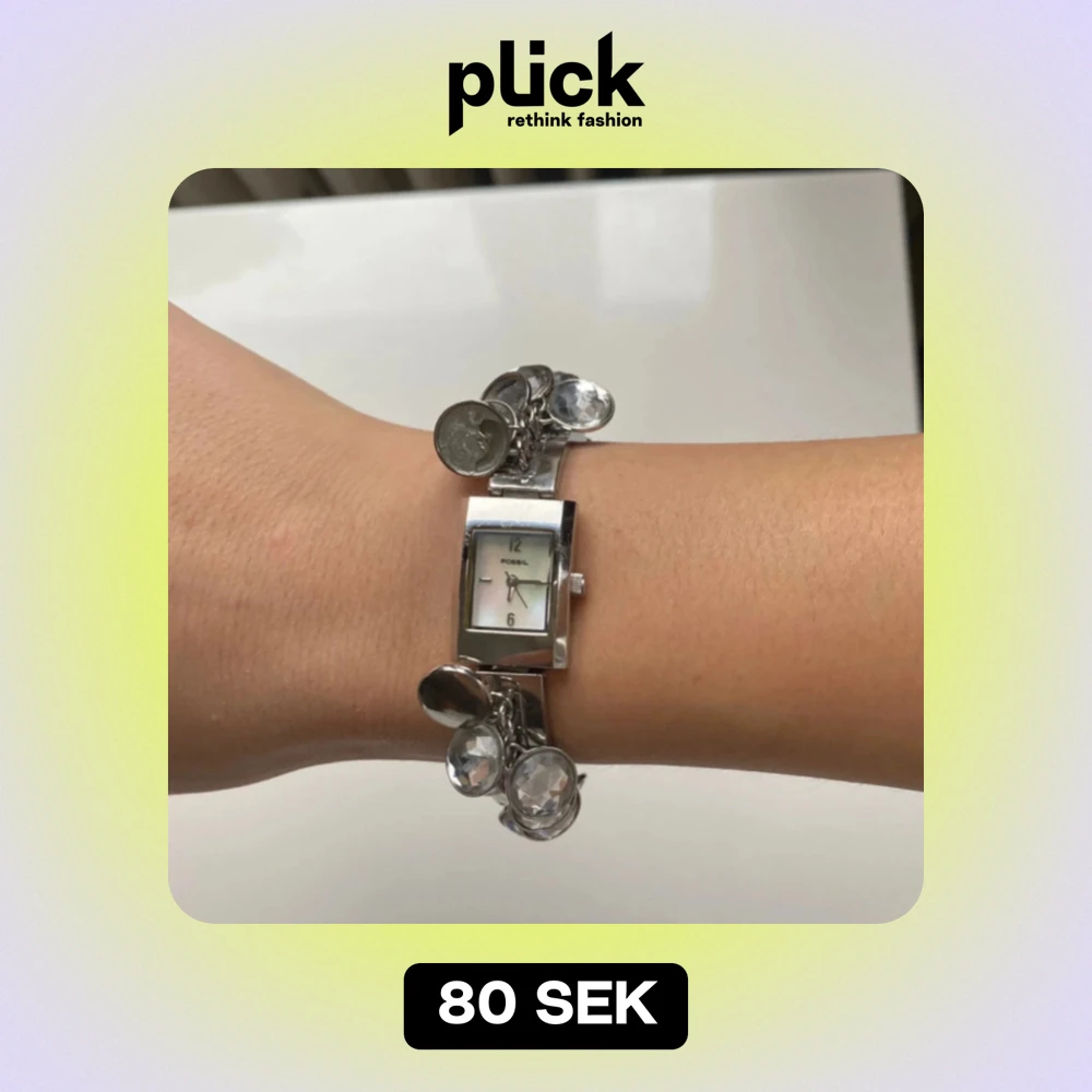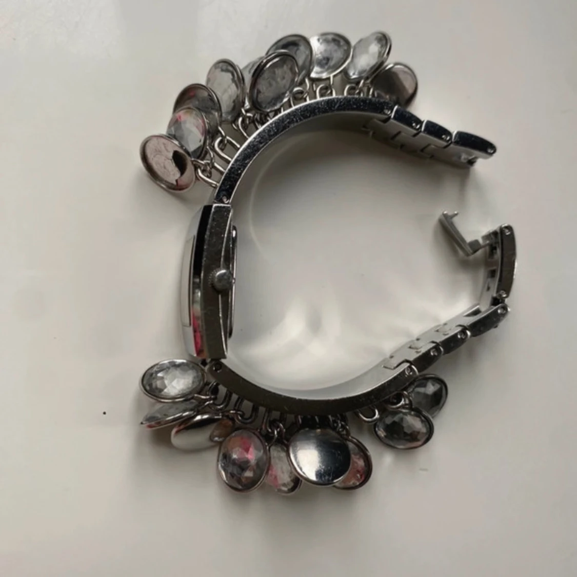 Säljer en snygg silverfärgad klocka från Fossil med glittriga detaljer. Klockan har en rektangulär urtavla och ett armband med stora, blanka stenar som ger en festlig look. Perfekt accessoar för att lysa upp vilken outfit som helst! Vissa diamant berlocker har gått sönder men är enkla att ta bort. Omkrets ca 15,5cm. Behöver nytt batteri.