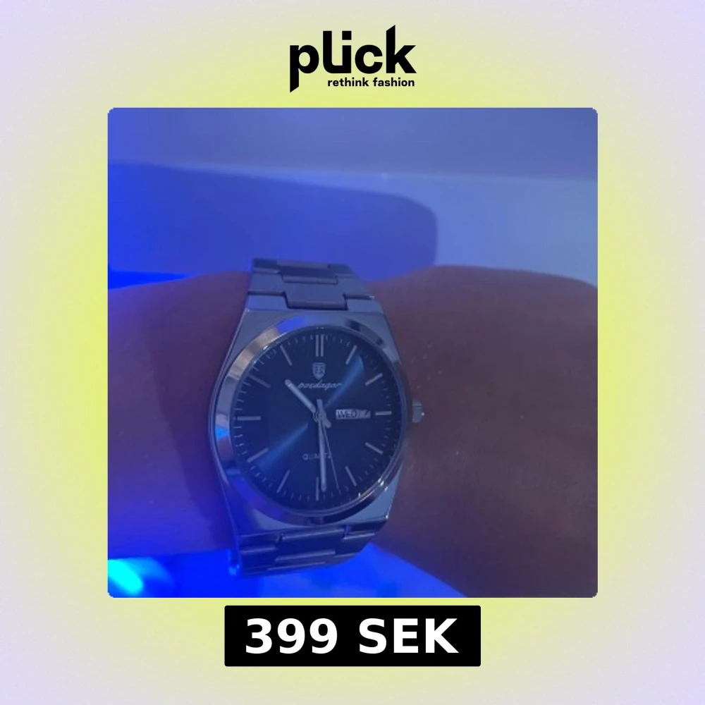 Stilren klocka från Poedagar med silverfärgat armband i metall och mörkblå urtavla. Klockan har dag- och datumvisning samt tydliga indexmarkeringar. Klassisk design som passar till många olika stilar.