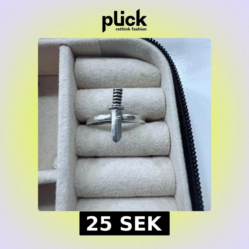 Unik silverfärgad ring med en cool svärd-detalj framtill. Ringen har en stilren och edgy design som sticker ut och passar perfekt för dig som gillar annorlunda accessoarer.