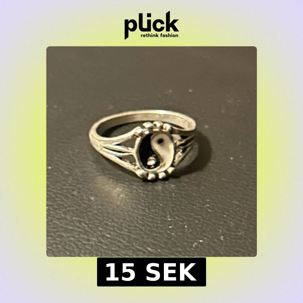 Säljer en silverfärgad ring med en yin-yang-symbol.