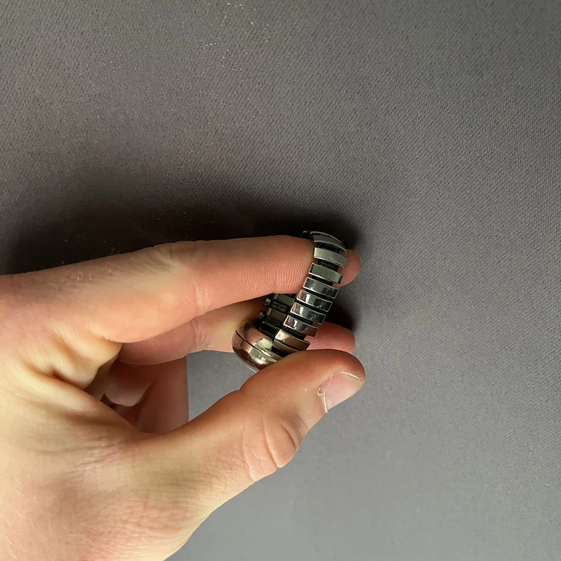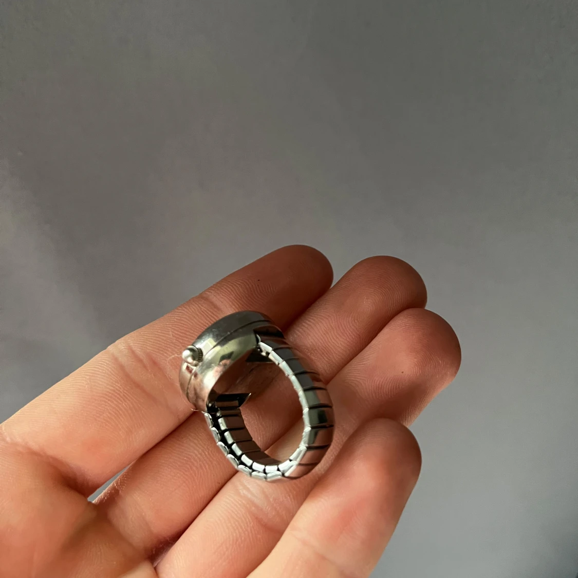 Unik ringklocka från Hit i silverfärgat metallmaterial. Klockan har en rund urtavla med minimalistisk design och ett elastiskt, segmenterat band som gör att den sitter bekvämt på fingret. Perfekt accessoar för dig som vill sticka ut med något annorlunda.