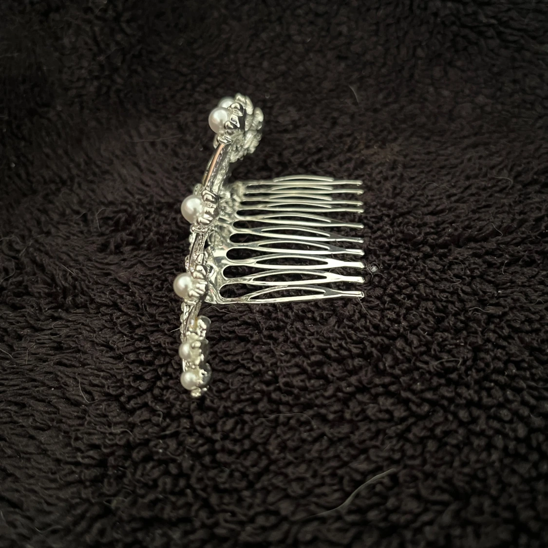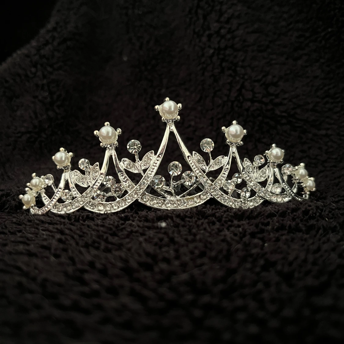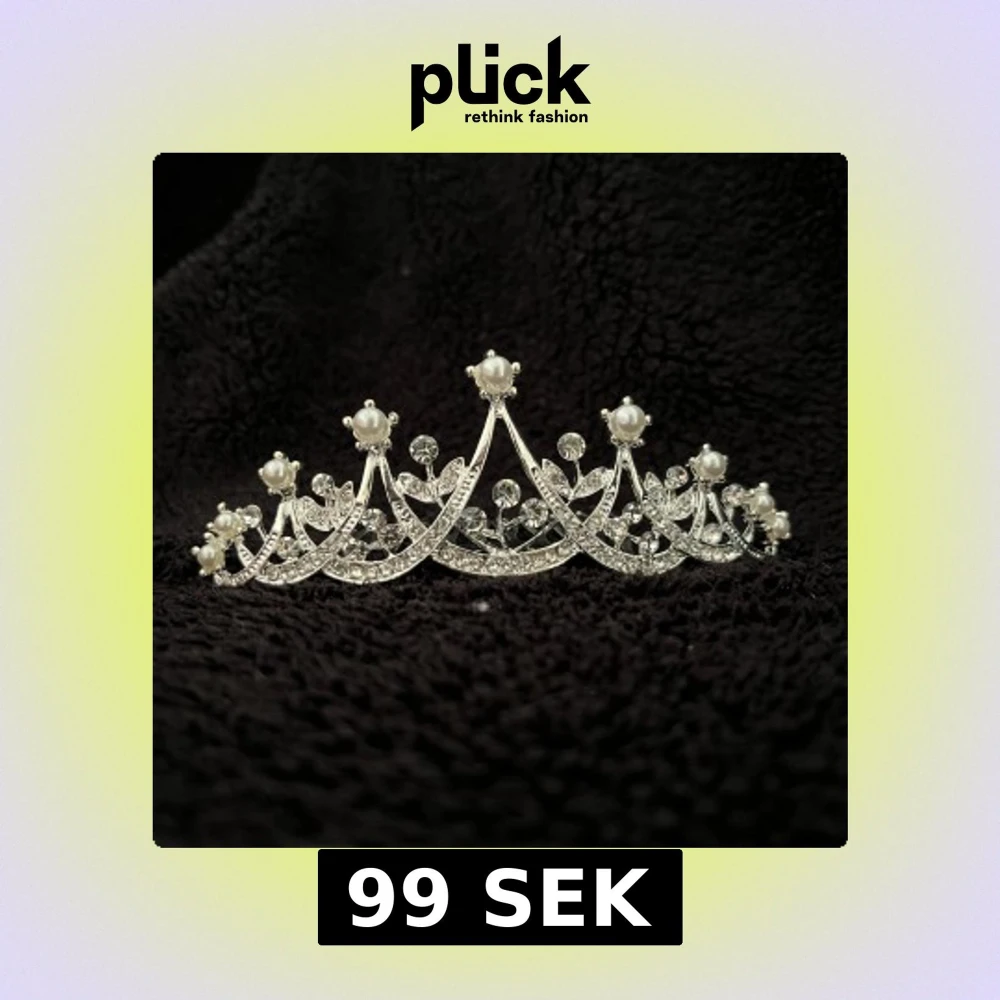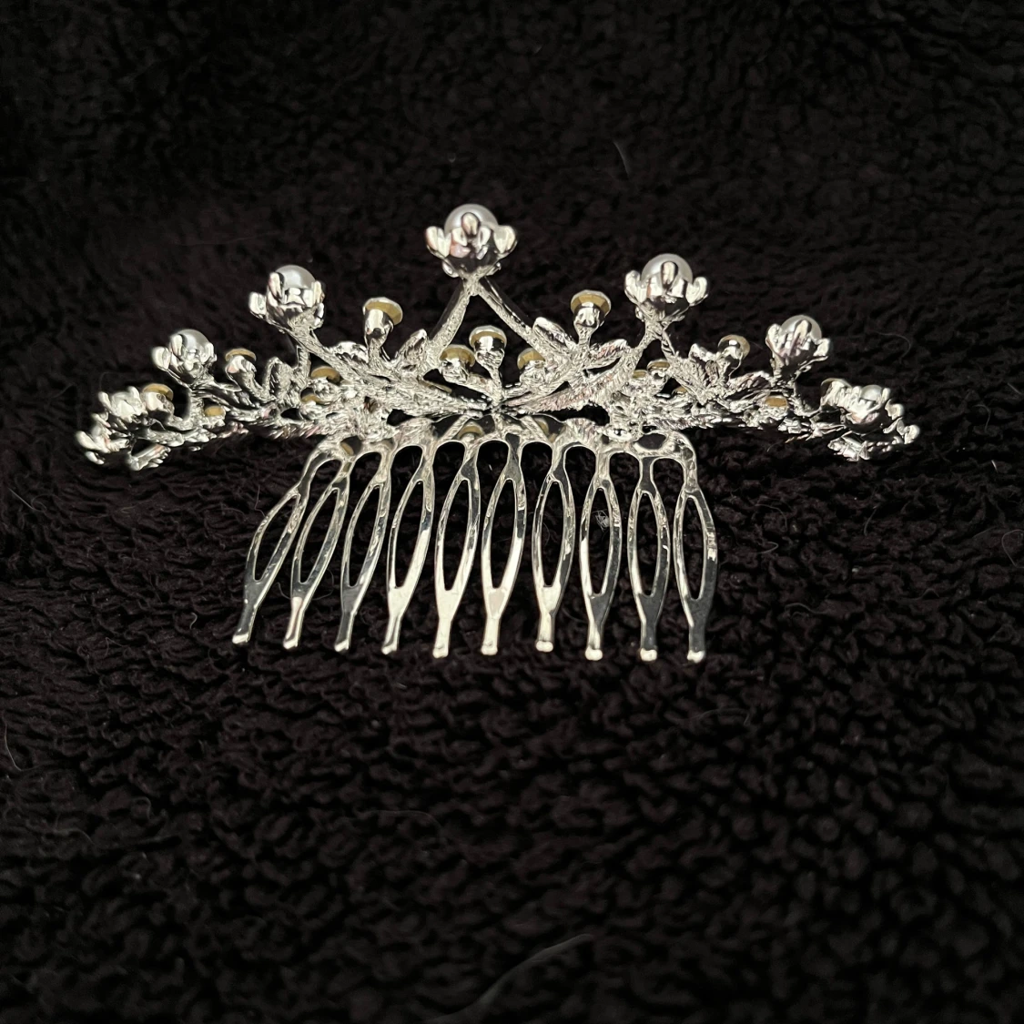 Elegant tiara i silverfärg med vackra pärldetaljer. Perfekt för speciella tillfällen med en stilren och glittrig design. Tiaran har en kam för enkel fastsättning i håret.