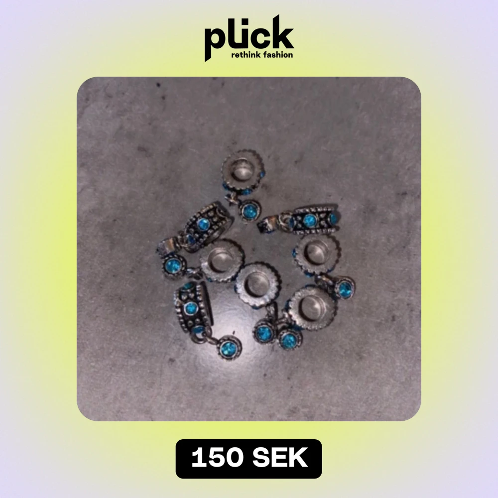 Ett set av silverfärgade berlocker med blå stenar. Berlockerna har en rund form med detaljerade kanter och små blå stenar infattade runt om. Varje berlock har en hängande blå sten. En berlock saknar en blå Sten. dessa är köpta i England och passar fint till pandoras armband