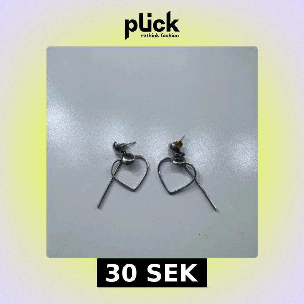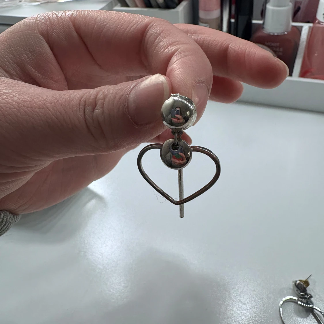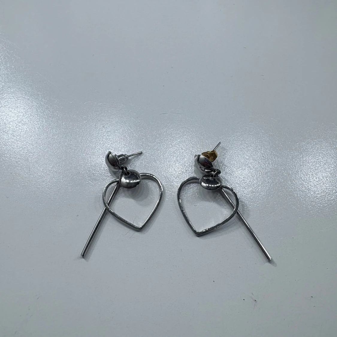 Säljer ett par unika örhängen i silverfärg med hjärtformad design och en rund kula upptill. Örhängena har en modern och stilren look med en stav som går genom hjärtat. Perfekta för att lyfta din outfit!