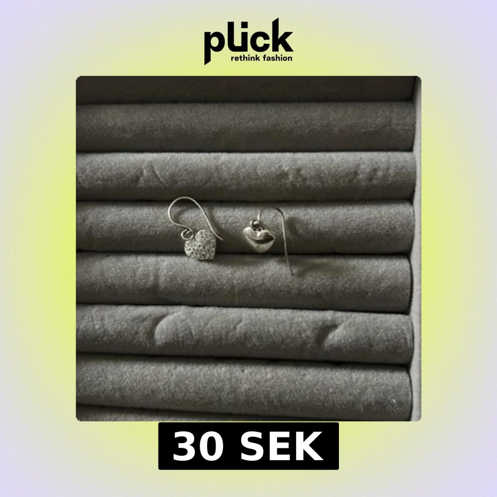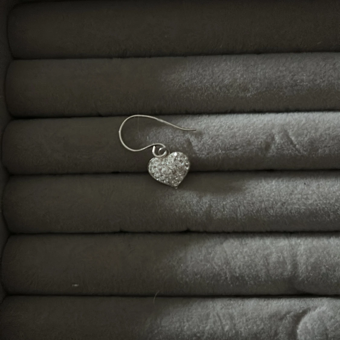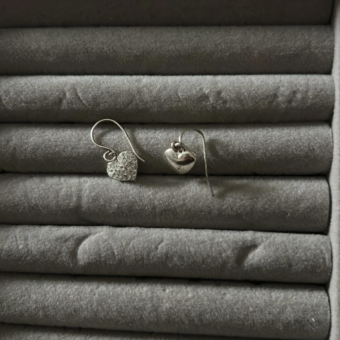 Charmiga silverfärgade örhängen med hjärtformad design. Ett av örhängena är dekorerat med glittrande stenar medan det andra har en slät. Man kan köpa båda eller en av dom skriv det till mig så fixar jag💕Inte så använda! 30kr st!