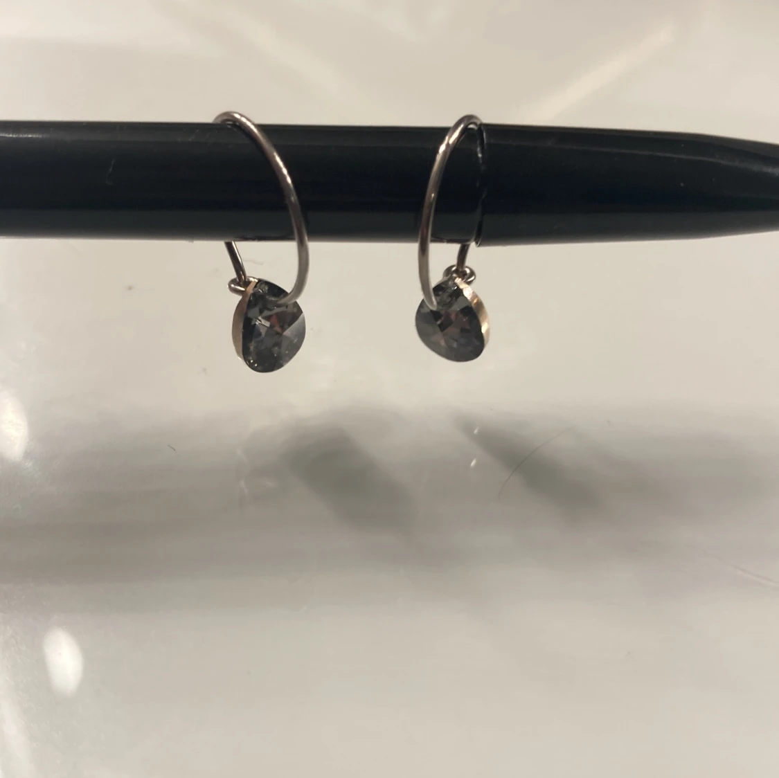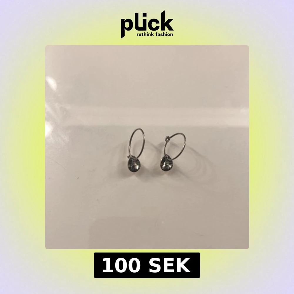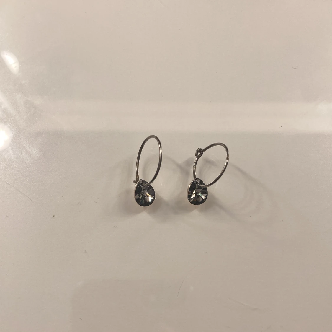 Säljer ett par stilrena örhängen i silverfärg med rund, glittrande sten som hänger i små hoops. Perfekta för att ge en elegant touch till din look. Nytt pris 249:- Jag rengör alla örhängen innan jag skickar!!