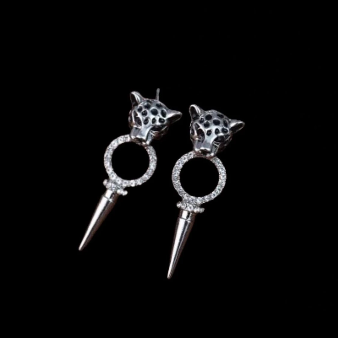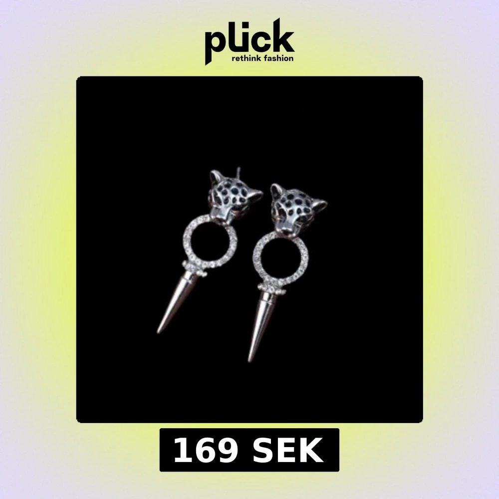 Unika örhängen i silverfärg med leopardhuvud, glittrande cirkel och spetsig hängande detalj. Djurinspirerad design som verkligen sticker ut och ger en edgy vibe till din look.