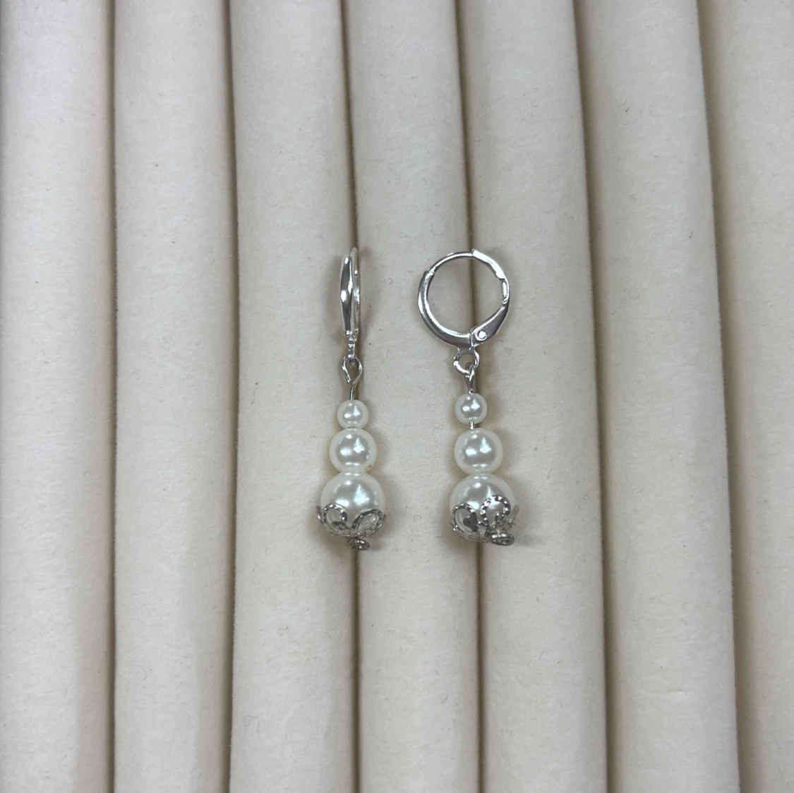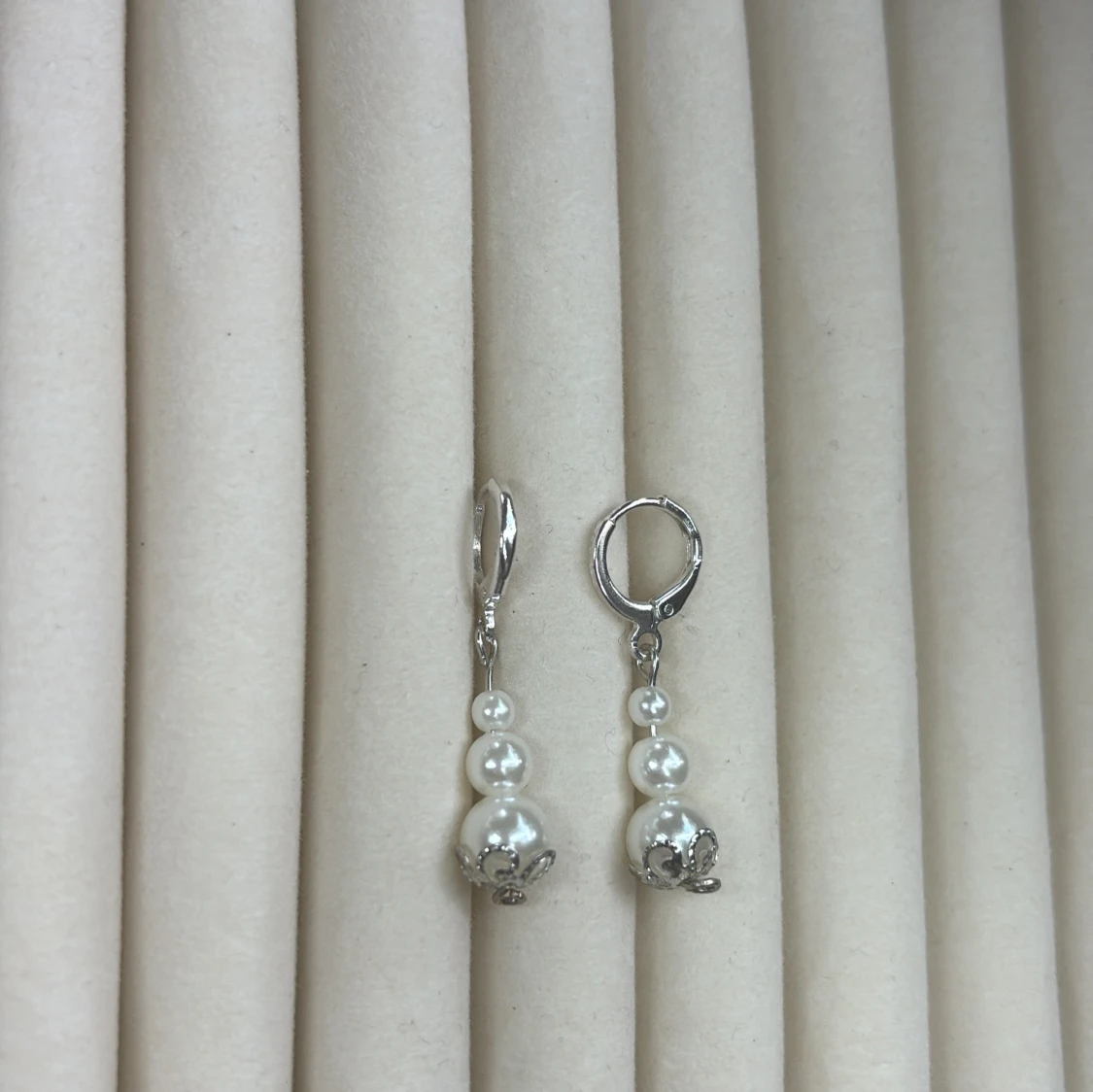 Säljer ett par eleganta örhängen i silverfärg med tre vita pärlor i olika storlekar på varje örhänge. Nedre pärlan har en dekorativ detalj i metall. Perfekta för att lyfta din look!