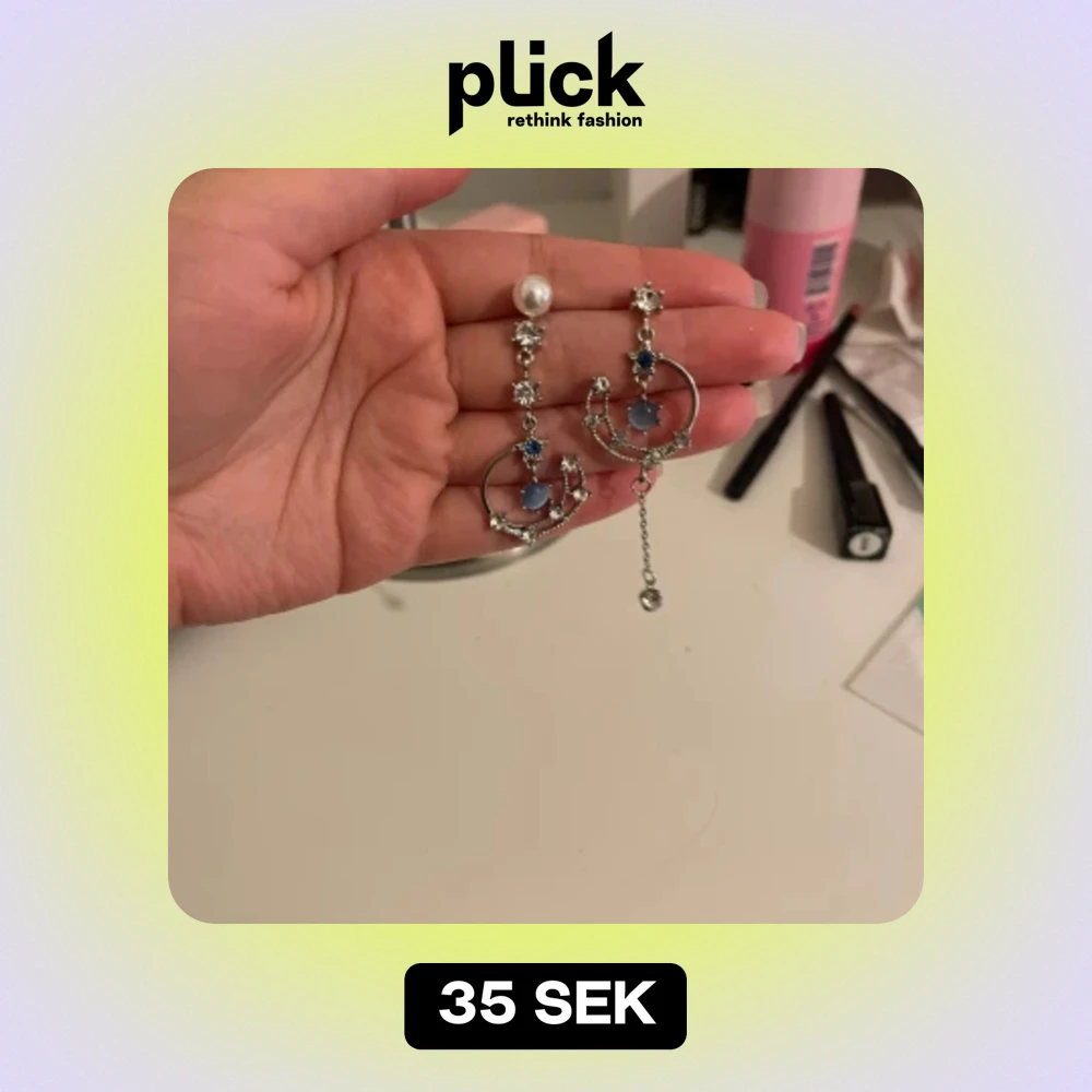 Säljer ett par unika och eleganta silverfärgade örhängen. De har en vacker design med pärlor och små stjärnor i blått och silver. Ena örhänget har en längre kedja som ger en asymmetrisk look. Perfekta för en fest eller en speciell kväll!