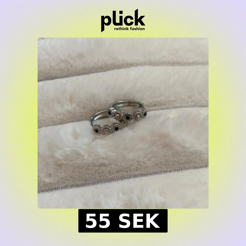 Säljer ett par runda silverfärgade örhängen med små gnistrande stenar och mörkblå detaljer. Örhängena har en elegant design med dekorativa inslag runt hela ringen. Perfekta för att lyfta din stil.