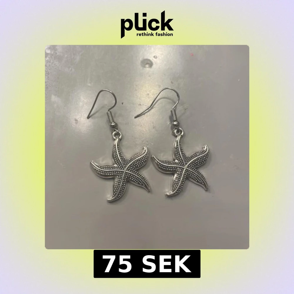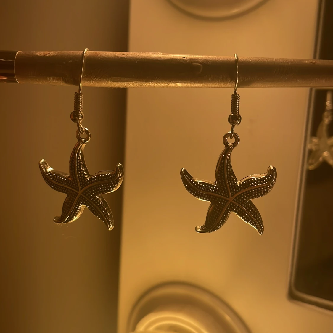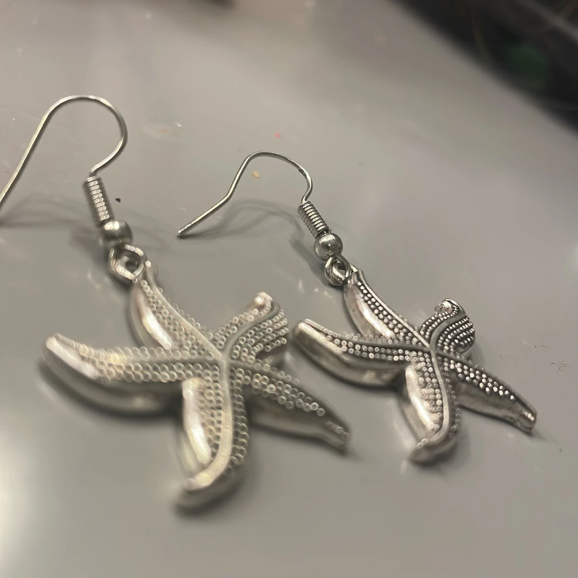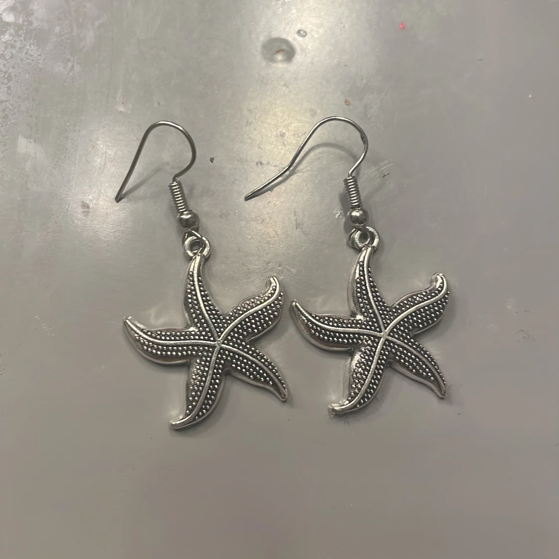 hemma gjorda Snygga örhängen i form av sjöstjärnor med detaljerade prickmönster. De är silverfärgade och har en krok för enkel användning. Perfekta för att ge en marin touch till din stil. bra skick! håller jättebra.