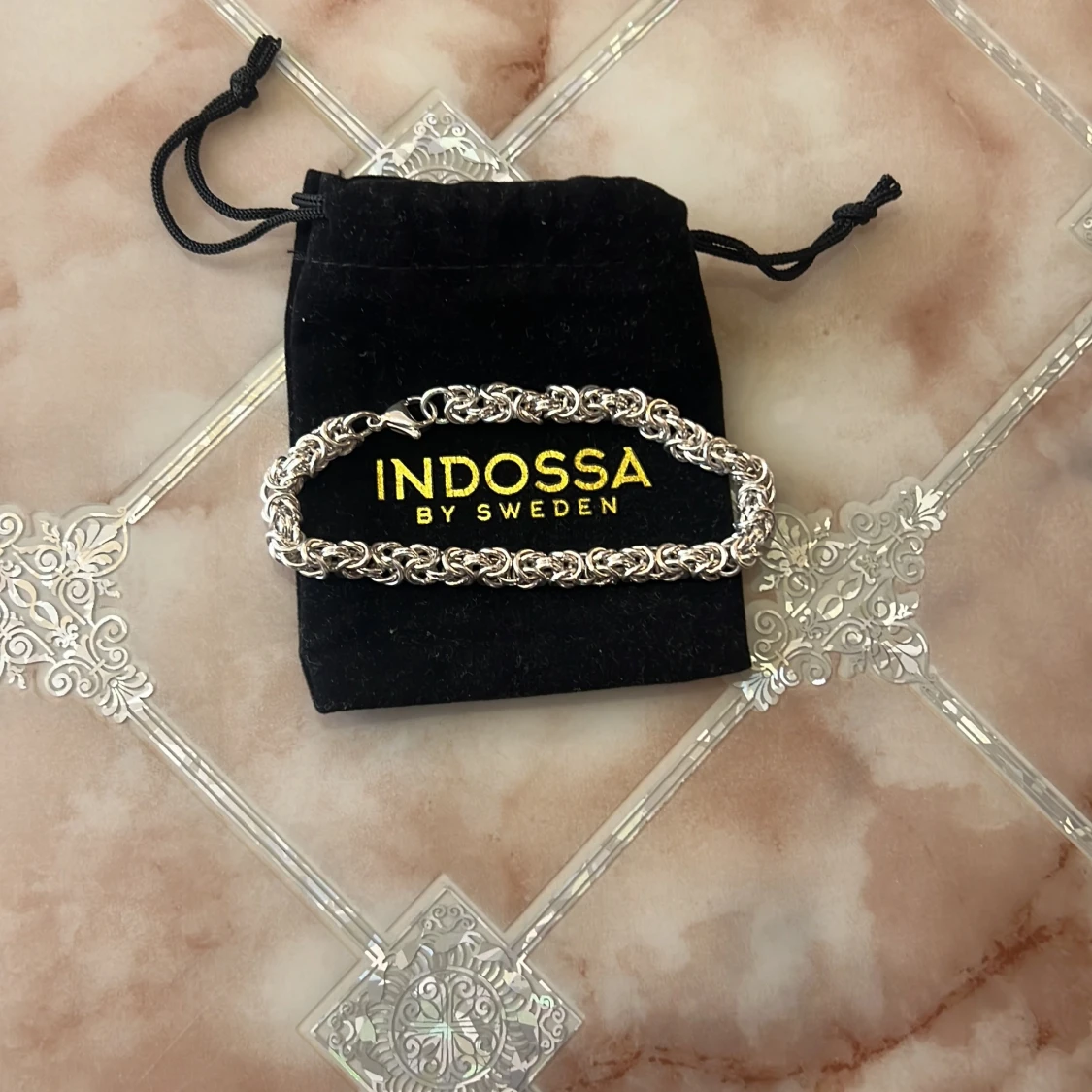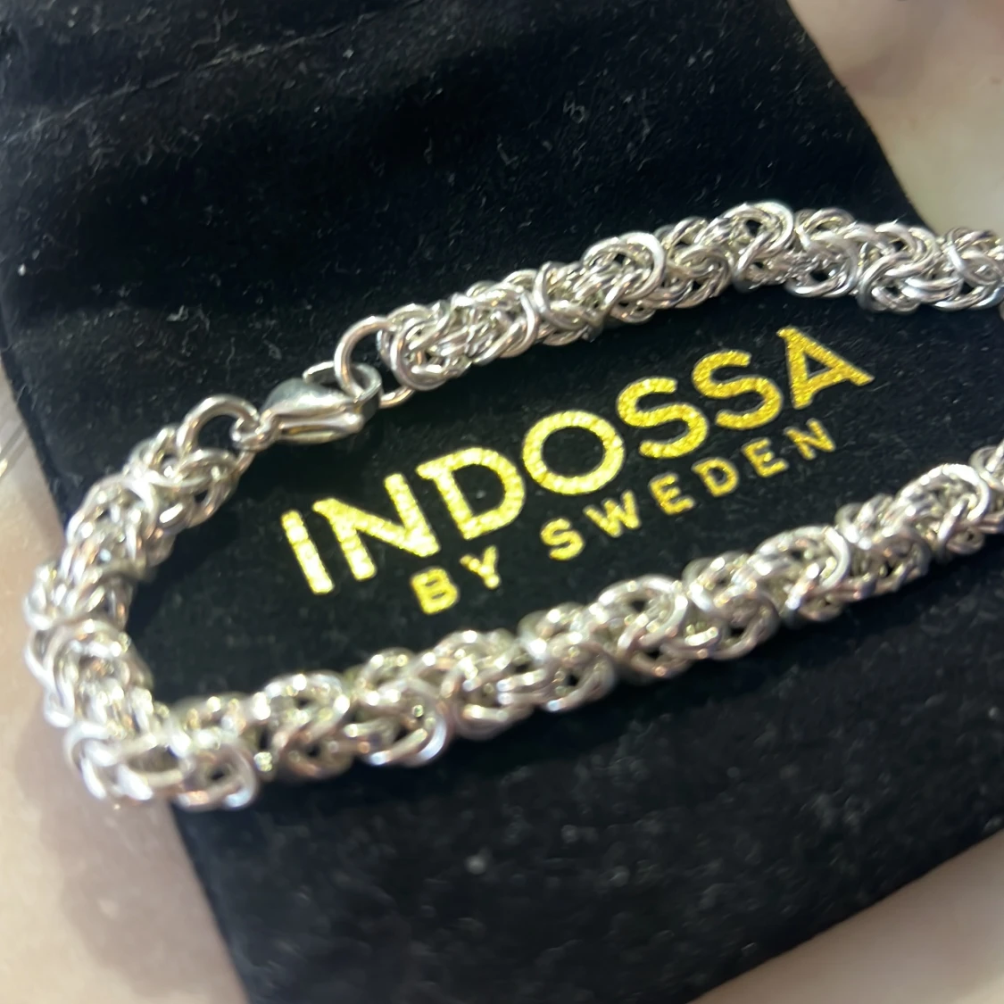 Snyggt armband i silverfärg från Indossa by Sweden. Armbandet har en cool, flätad kedjedesign som ger en chunky och trendig look. Perfekt accessoar för att lyfta din outfit. Levereras i svart tygpåse med guldfärgad logga.