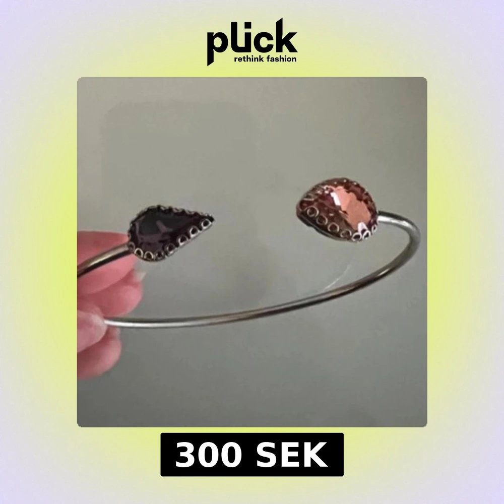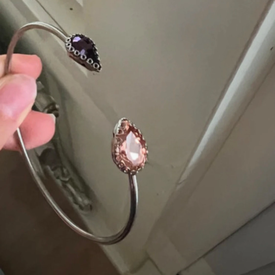 Snyggt armband i silverfärg 925 äkta doppad i guld med två droppformade smaragder i lila och rosa. Stenarna sitter i varsin ände av det öppna armbandet och har en dekorativ infattning. Perfekt accessoar för att lyfta din stil. Pris kan diskuteras