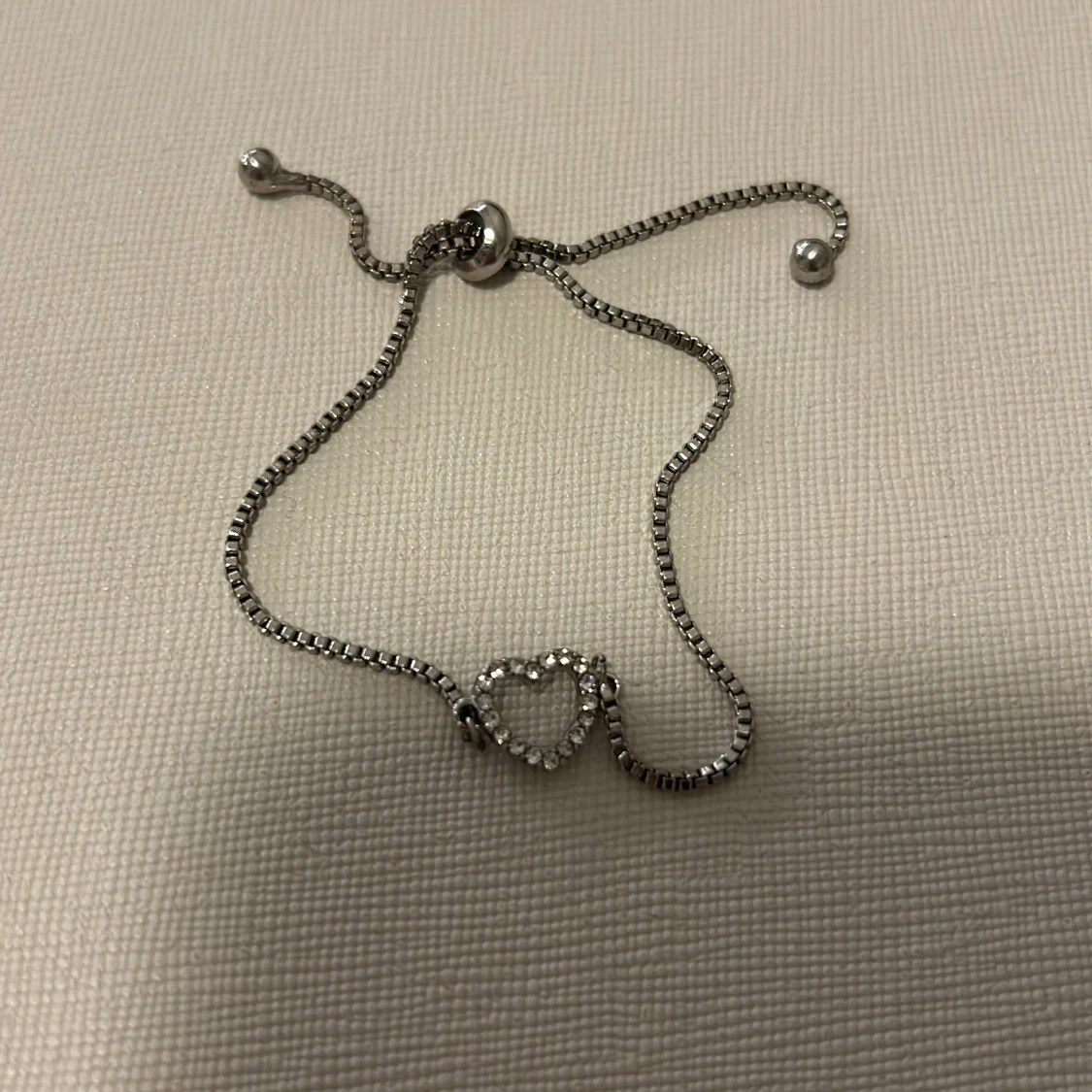 Elegant silverfärgat armband med ett glittrande hjärta i mitten. Armbandet har en justerbar kedja med små kulor i ändarna för enkel anpassning. Perfekt för att lägga till en touch av glamour till din outfit.