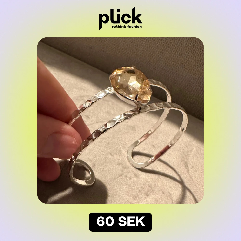 Snyggt och unikt armband i silverfärg med en stor, glittrande sten i mitten. Armbandet har en hamrad yta som ger det en rustik och elegant look. Perfekt för att lyfta vilken outfit som helst, oavsett om det är till fest eller vardag. Stenen är ljus och fångar ljuset vackert. Ett måste för smyckesälskare!