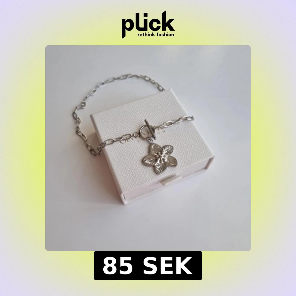 Stilrent halsband i silverfärg en kedja i större länkar och en vacker blomformad berlock. Halsbandet har en snygg T-bar låsning som gör det enkelt att ta på och av. Perfekt för dig som gillar detaljer med blommor och modern design. Lådan ingår ej.