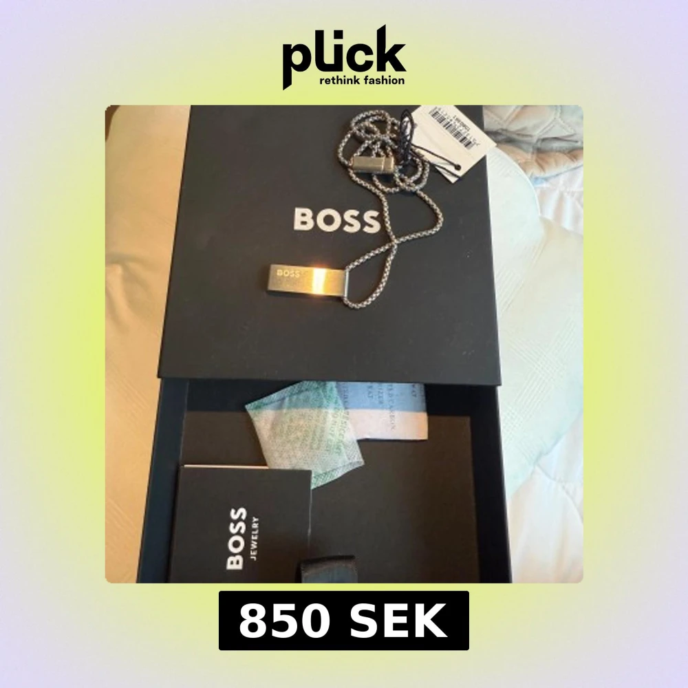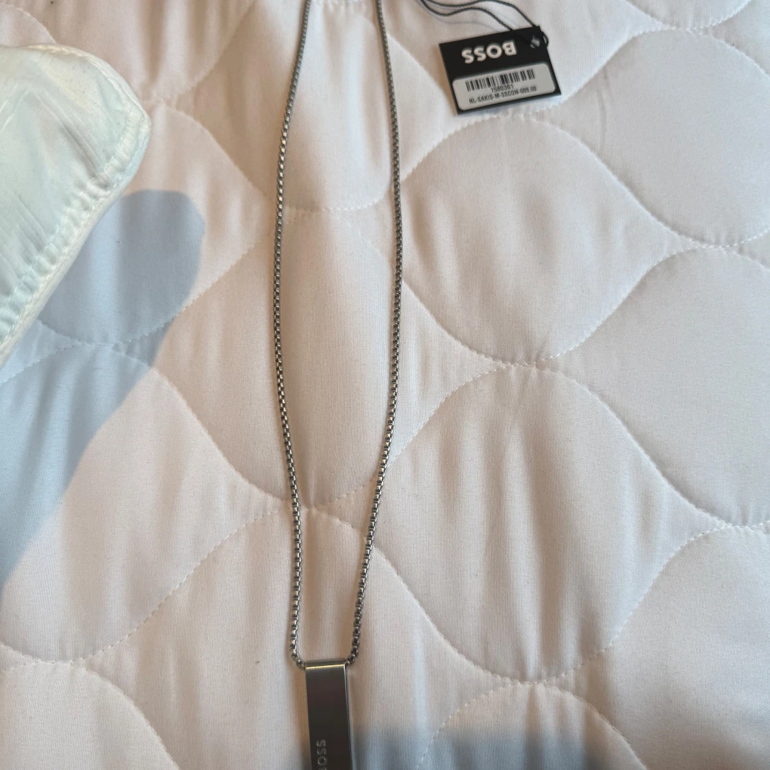 Stilrent halsband från BOSS i silverfärg med en rektangulär platta där BOSS-loggan är ingraverad. Kedjan är av klassisk modell och halsbandet levereras i originalask med märkning och etikett.