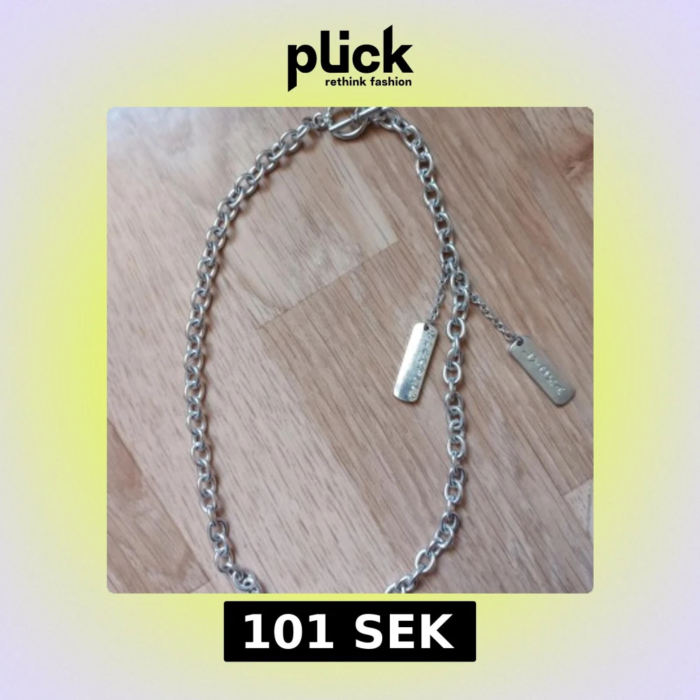 Snyggt silverfärgat halsband med två berlocker. Ena berlocken har gnistrande stenar och den andra har texten 'LYCKA'. Halsbandet har en stilren kedja och ett enkelt lås.