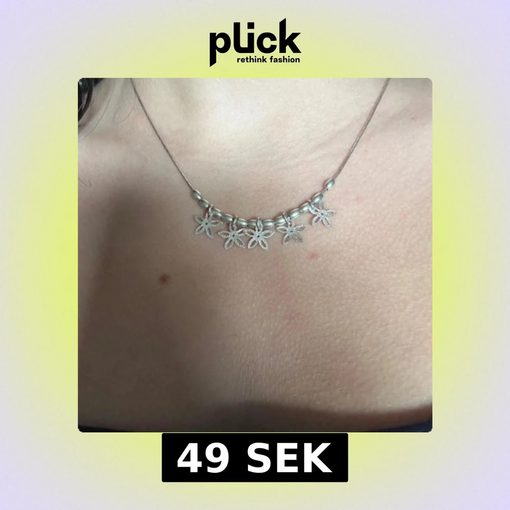 Snyggt halsband i silverfärg med fem hängande blommor och ovala pärlor längs kedjan. Blommorna har en detaljrik design som ger ett unikt och trendigt uttryck. Perfekt för dig som gillar smycken med lite extra personlighet och blommiga detaljer.