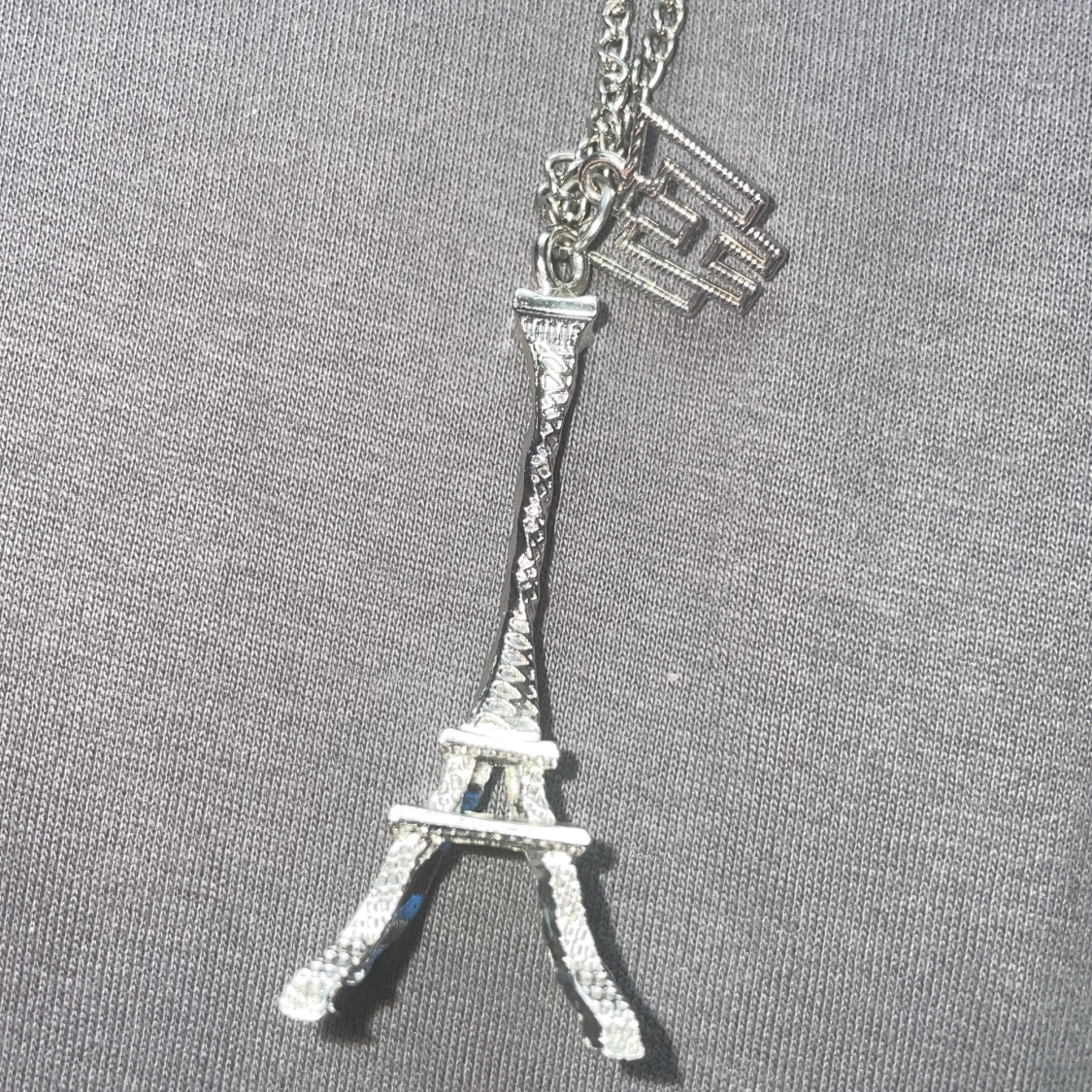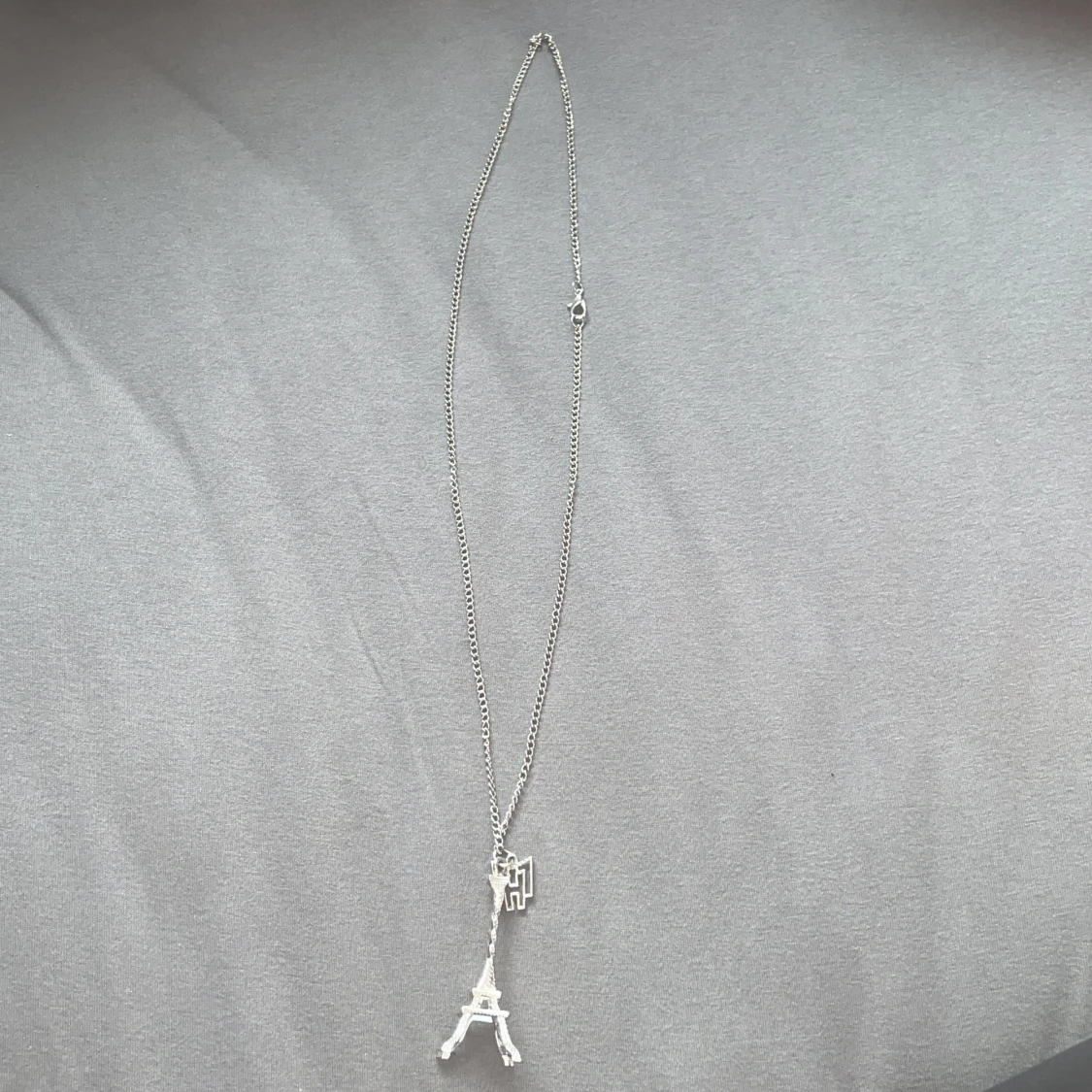 Säljer ett snyggt silverfärgat halsband med en hängande Eiffeltornsberlock. Kedjan är tunn och elegant, perfekt för både vardag och fest. Berlocken är detaljerad och ger en chic touch till din outfit. Köp nu och få en bit av Paris med dig! 🌟