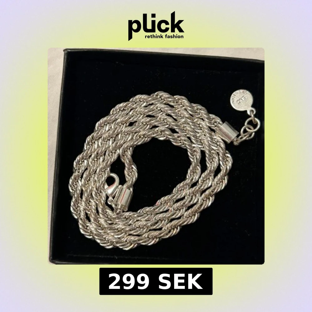 Snyggt silverfärgat halsband med en tvinnad design som ger en elegant look. Perfekt för att lyfta vilken outfit som helst. Den är cirka 50 cm. Har aldrig använts helt ny!