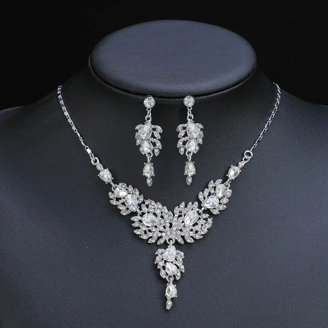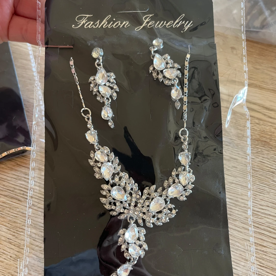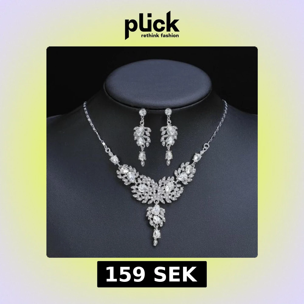 Elegant set med ett silverfärgat halsband och matchande örhängen. Smyckena är dekorerade med glittrande stenar i ett bladmönster som ger en lyxig känsla. Perfekt för speciella tillfällen där du vill glänsa lite extra.