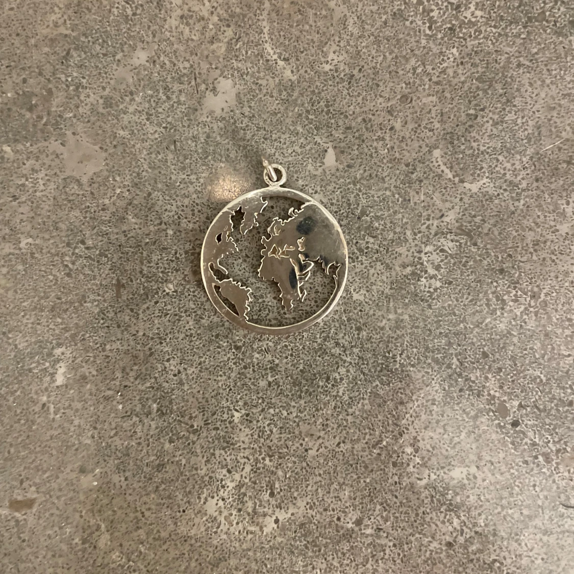 Säljer ett stilrent hängsmycke i äkta silver med ett utskuret motiv av en världskarta. Perfekt för den som älskar att resa eller vill ha en unik detalj i sin smyckessamling.