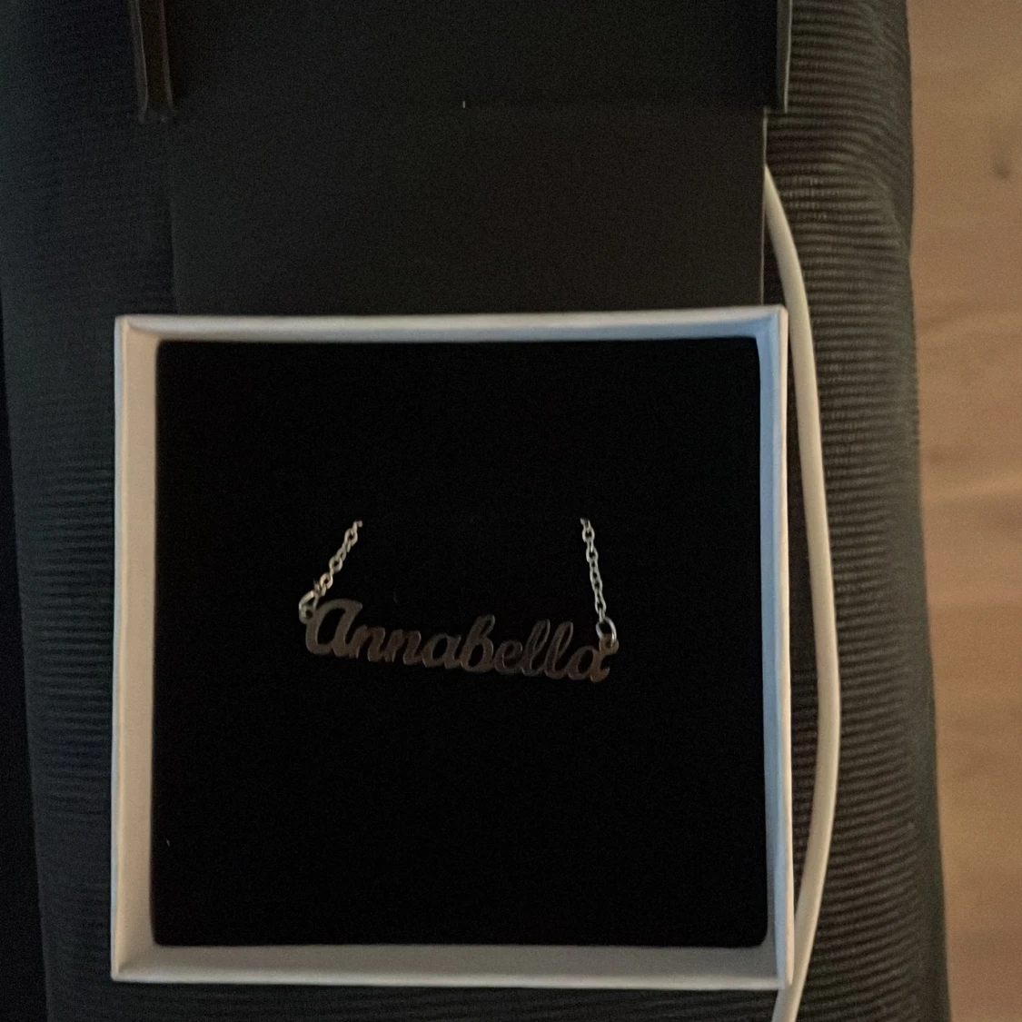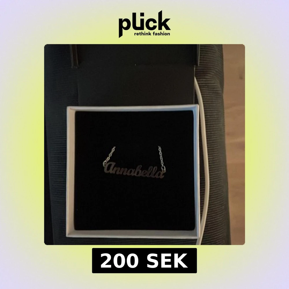 Stilrent halsband i silverfärg med namnet Annabella i skrivstil. Kedjan är tunn och smycket levereras i en elegant ask, perfekt som personlig accessoar eller present. Aldrig använt och rostfri. Köpte den för ca 2 år sen. Kommer inte ihåg vartifrån