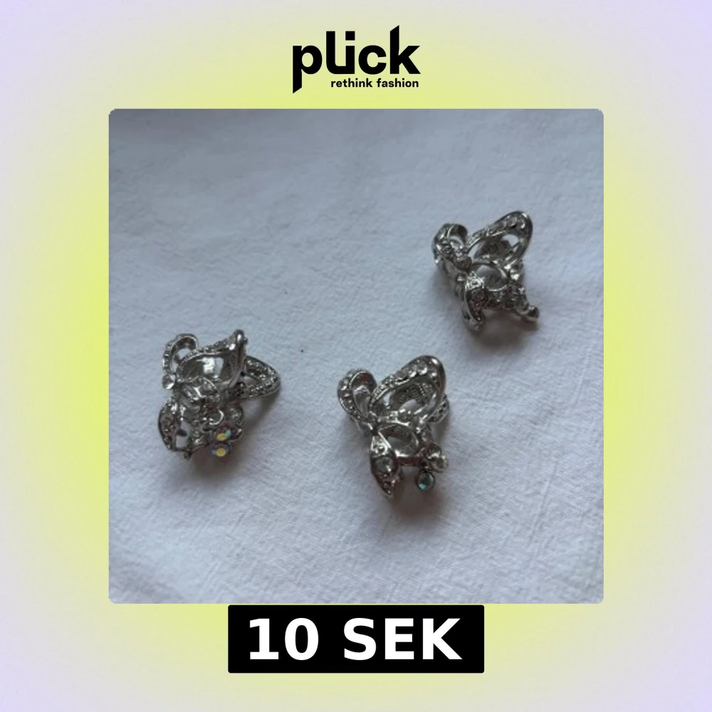 Tre hårklämmor i form av glittriga rosetter i silverfärg med små strasstenar och hängande detaljer. De har en snygg, öppen design och gnistrar fint i ljuset. Perfekta för dig som vill ha något extra till din look.