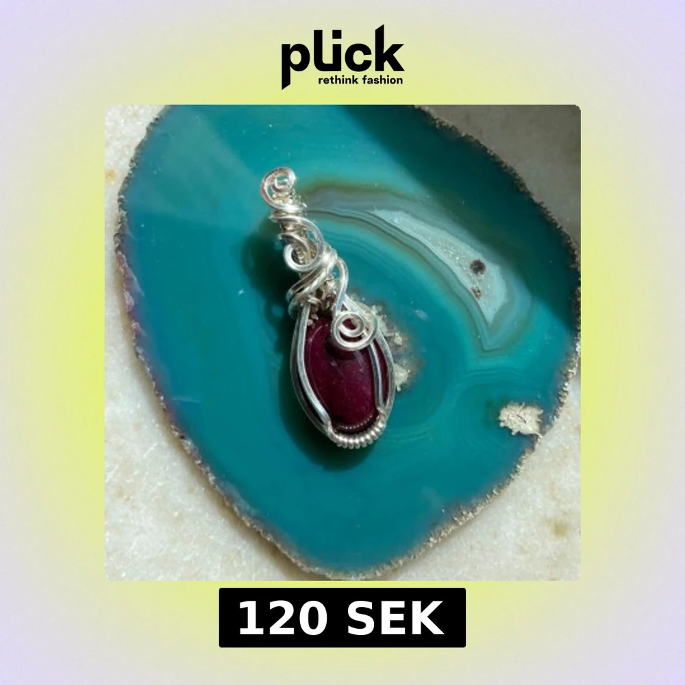 Unikt halsband med en oval, vinröd sten infattad i snirklig silverfärgad wire. Hängsmycket har en cool, handgjord känsla med detaljerade spiraler och en elegant, bohemisk vibe. Perfekt för dig som vill sticka ut med ett personligt smycke.