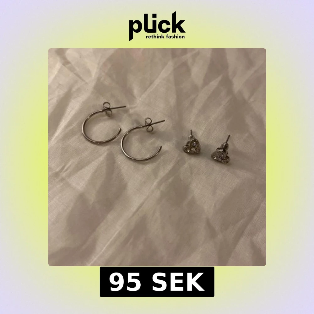Två par silverörhängen: ett par klassiska hoops och ett par hjärtformade stiftörhängen med glittriga detaljer. Perfekta för att mixa och matcha beroende på humör och stil.