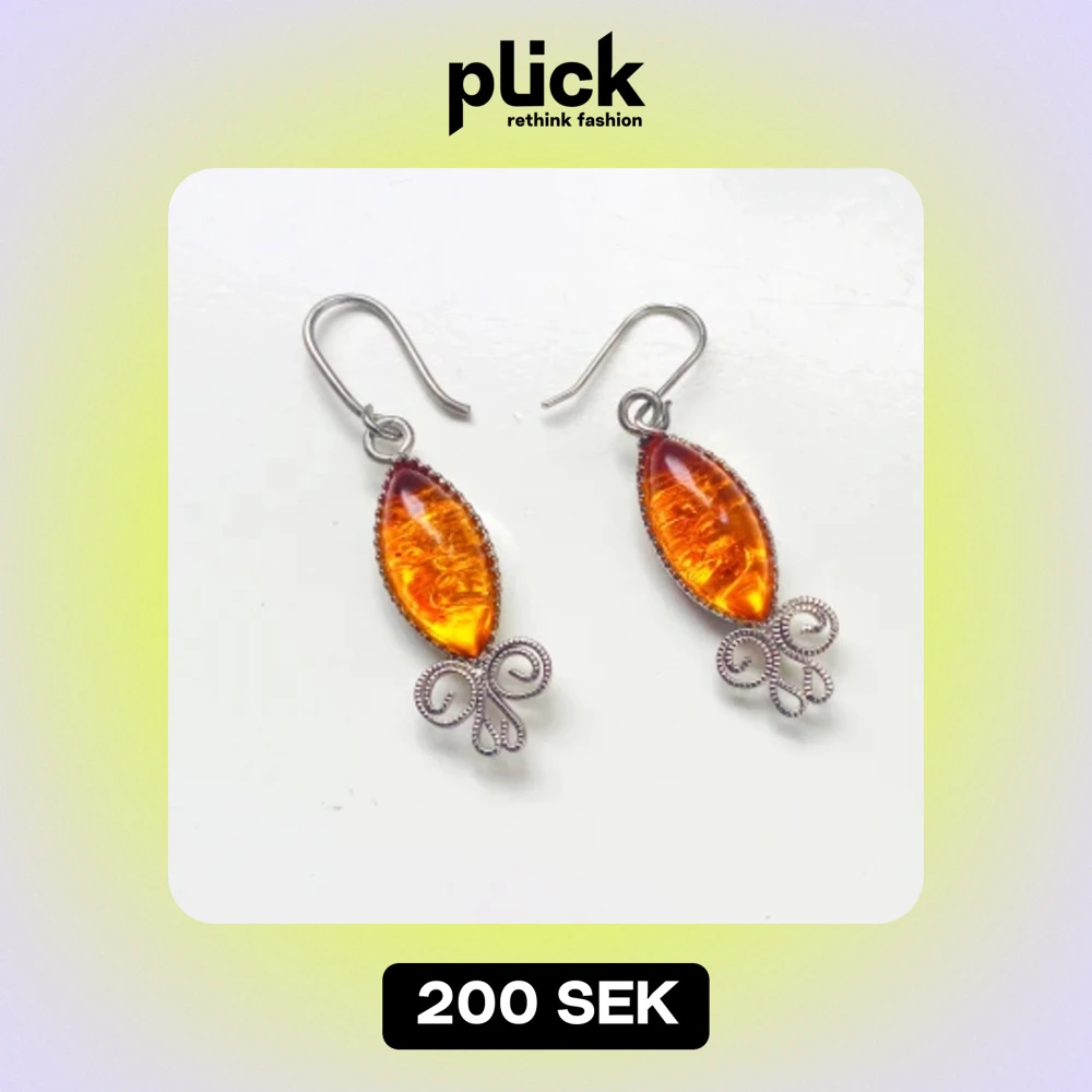 Säljer ett par snygga vintage örhängen med en stor, oval orange rhinestone. Stenen har en vacker, skimrande yta och örhängena har en unik design med dekorativa detaljer i silver under stenen. Perfekta för att ge en färgklick till din outfit! Okänt material
